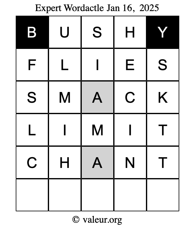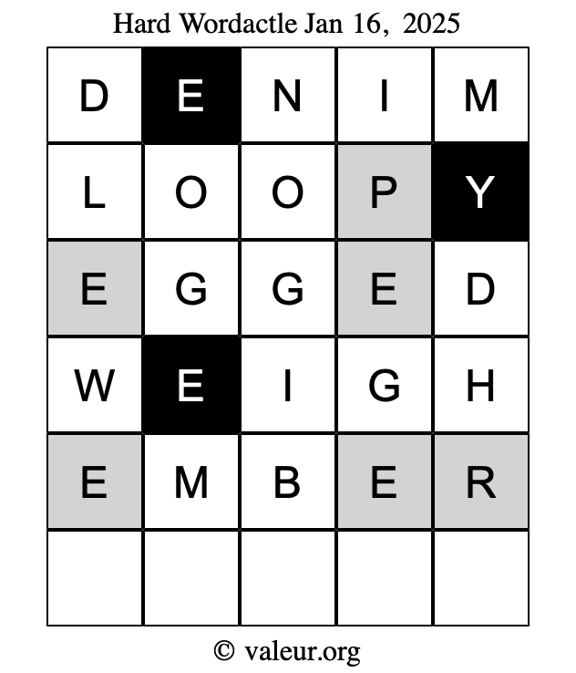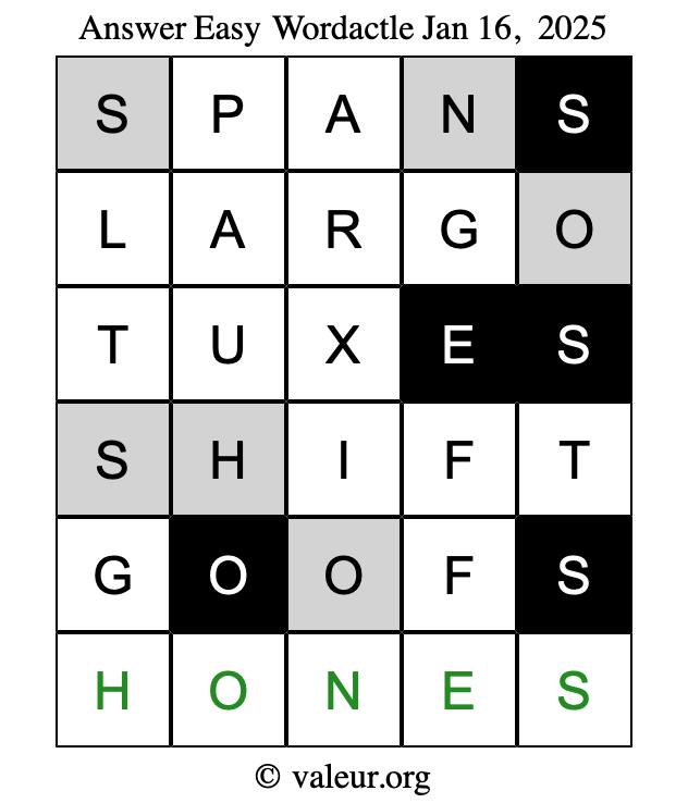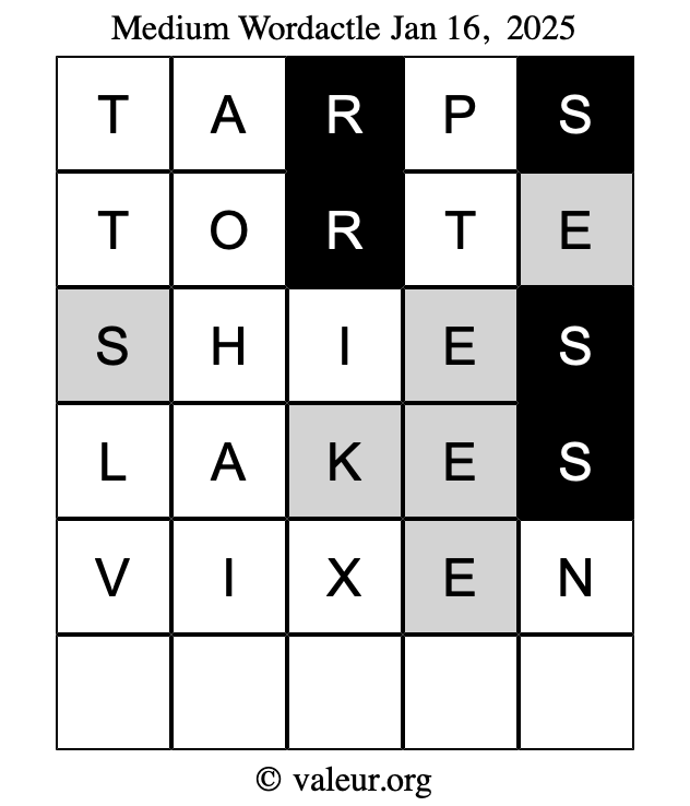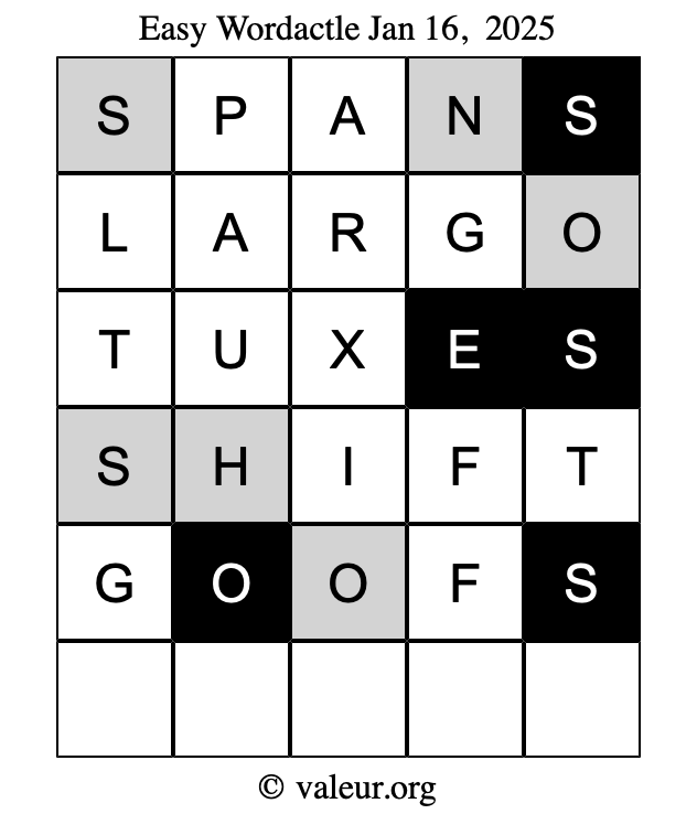 Here are the January 16, 2025 daily four Wordactle puzzles. You are welcome to print a copy of the puzzles and solve them by hand. For your convenience, we have also included the solutions further down the page so you can check your work.