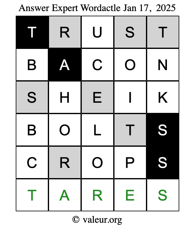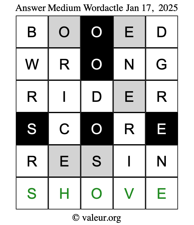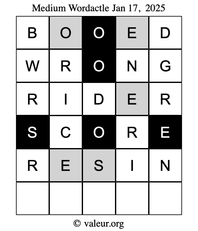 Here are the January 17, 2025 daily four Wordactle puzzles. You are welcome to print a copy of the puzzles and solve them by hand. For your convenience, we have also included the solutions further down the page so you can check your work.