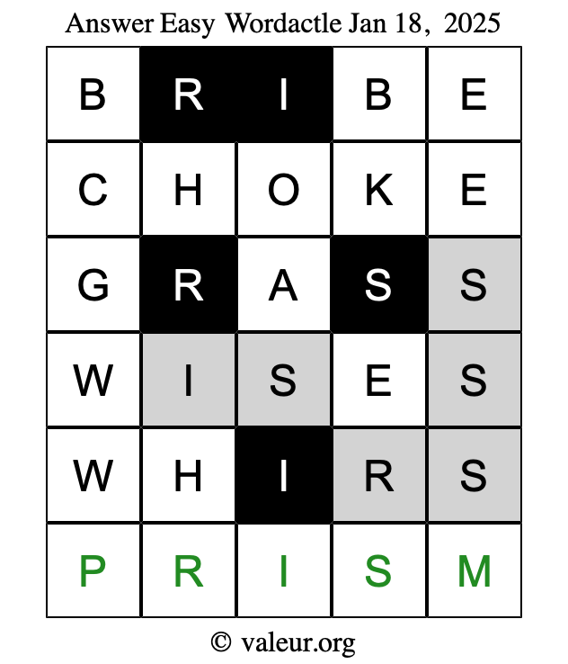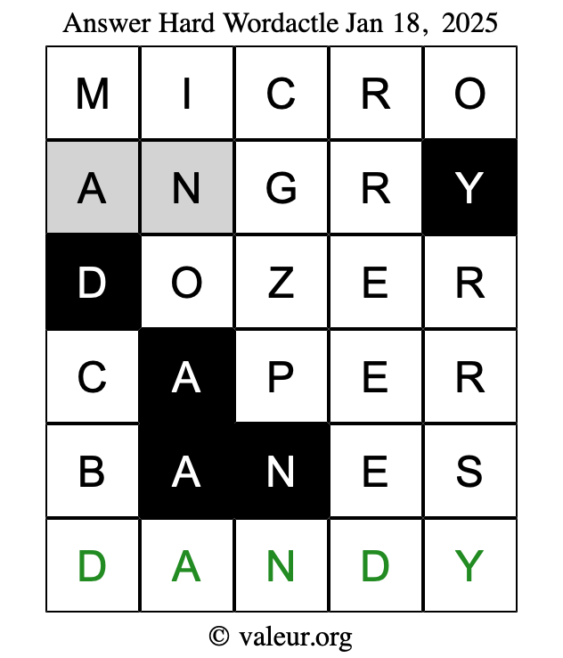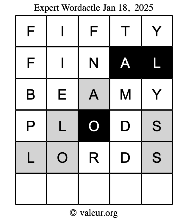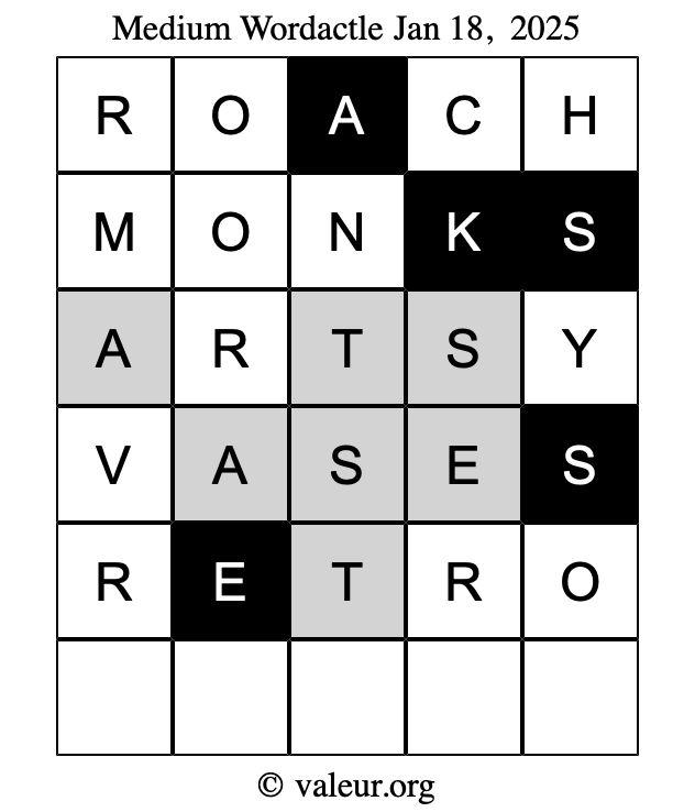 Here are the January 18, 2025 daily four Wordactle puzzles. You are welcome to print a copy of the puzzles and solve them by hand. For your convenience, we have also included the solutions further down the page so you can check your work.