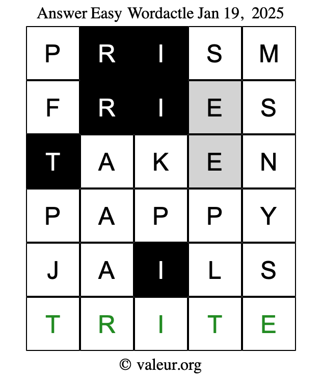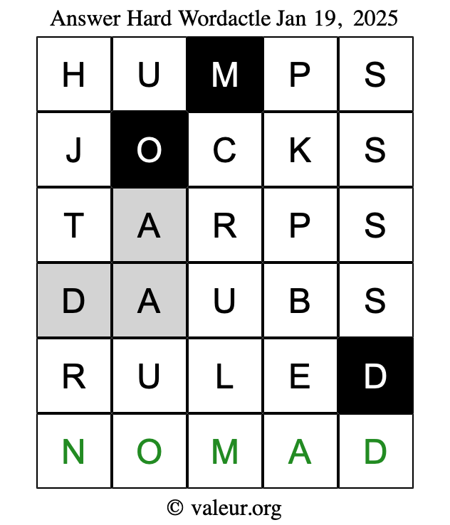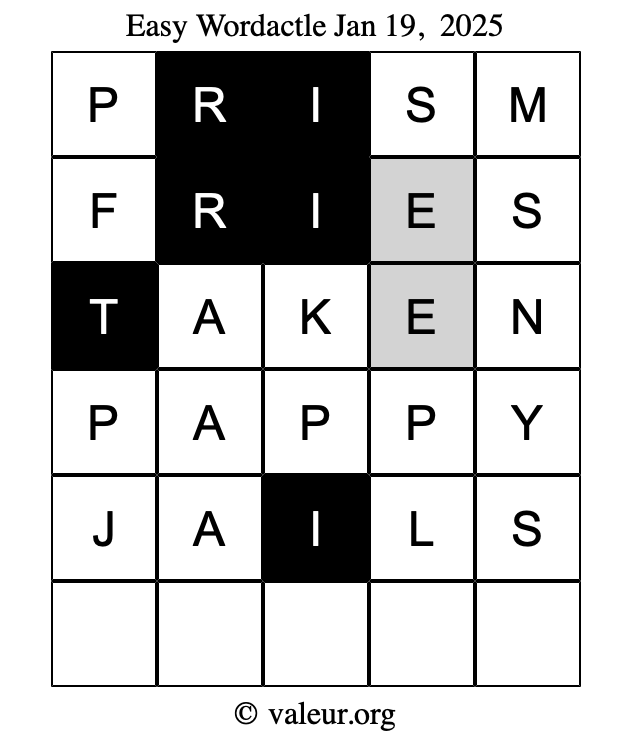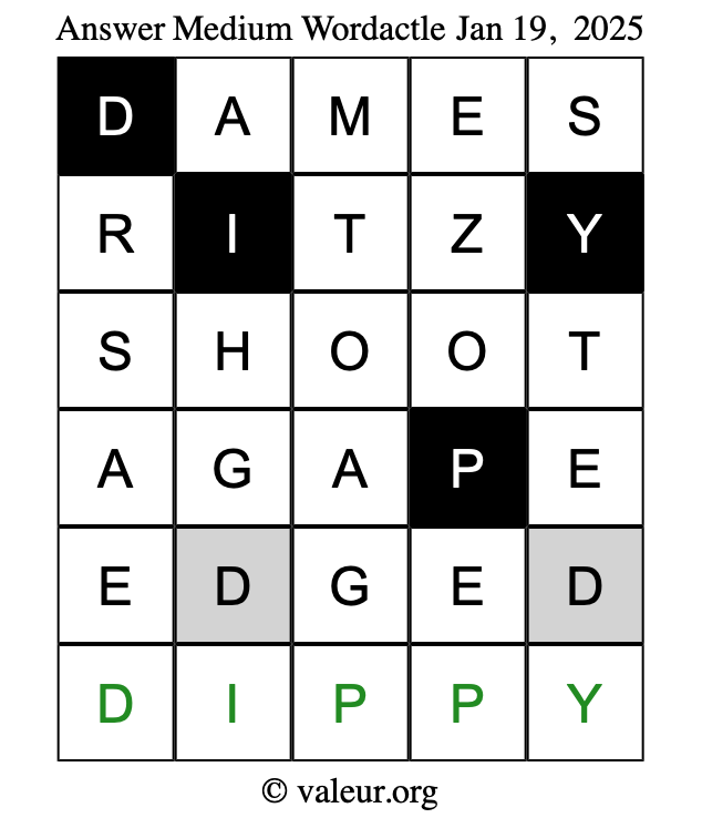Here are the January 19, 2025 daily four Wordactle puzzles. You are welcome to print a copy of the puzzles and solve them by hand. For your convenience, we have also included the solutions further down the page so you can check your work.