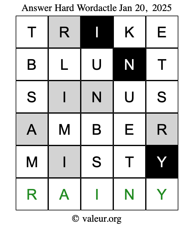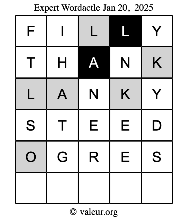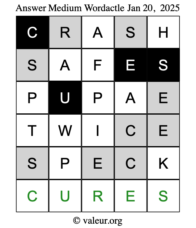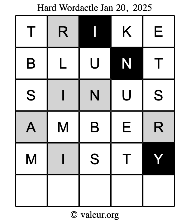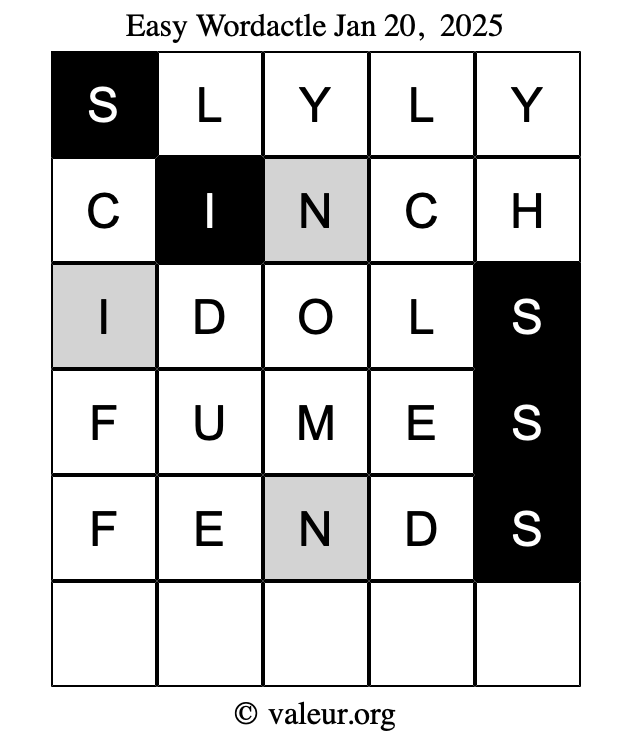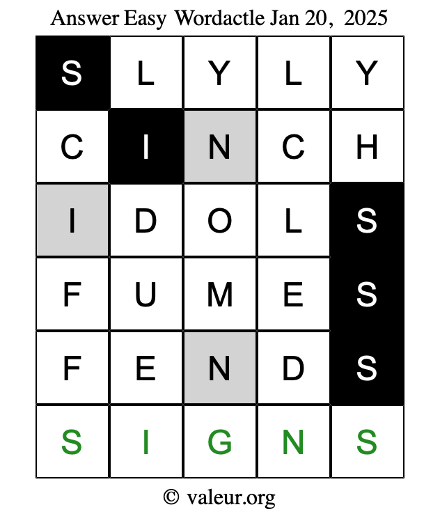 Here are the January 20, 2025 daily four Wordactle puzzles. You are welcome to print a copy of the puzzles and solve them by hand. For your convenience, we have also included the solutions further down the page so you can check your work.
