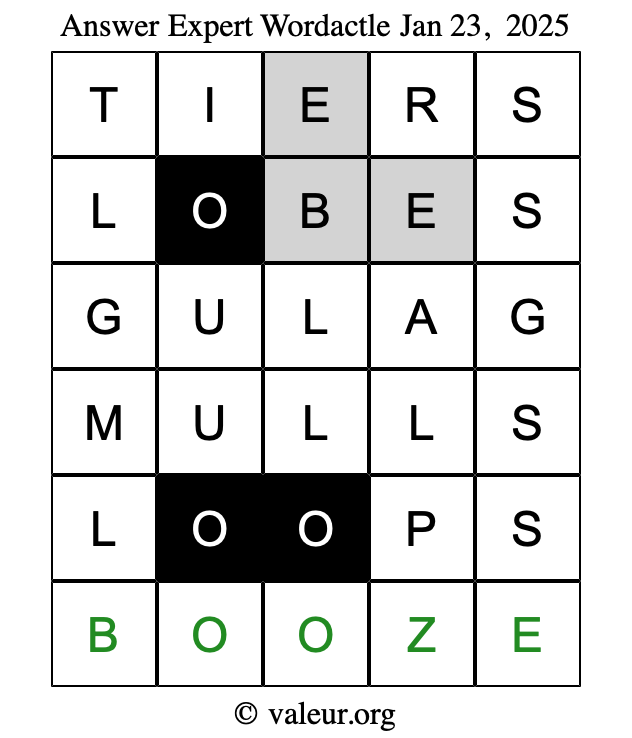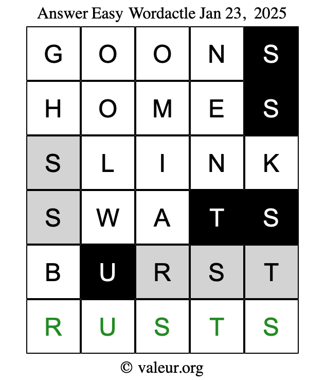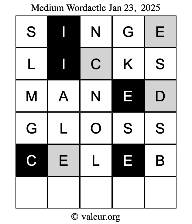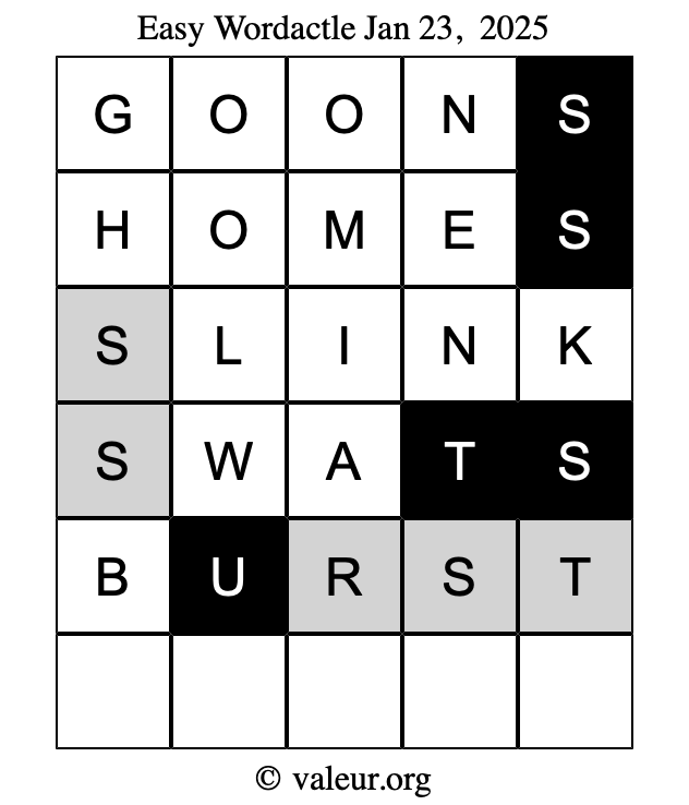 Here are the January 23, 2025 daily four Wordactle puzzles. You are welcome to print a copy of the puzzles and solve them by hand. For your convenience, we have also included the solutions further down the page so you can check your work.