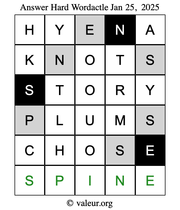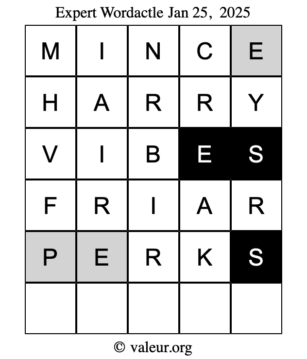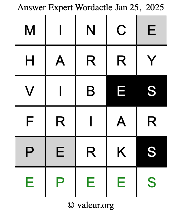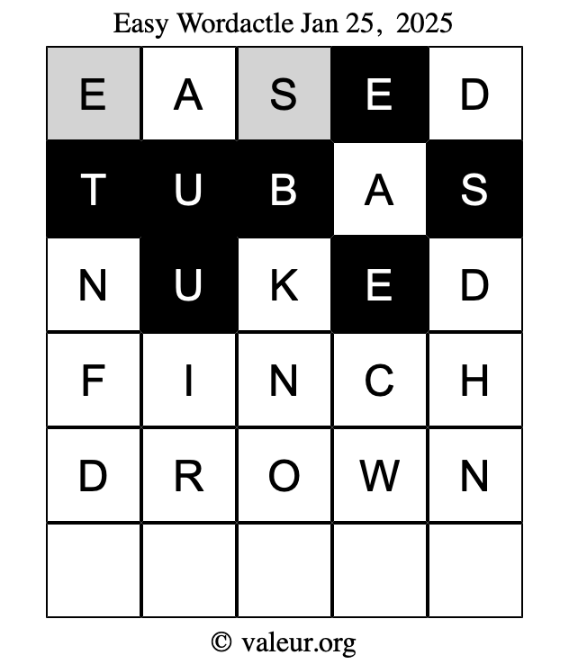 Here are the January 25, 2025 daily four Wordactle puzzles. You are welcome to print a copy of the puzzles and solve them by hand. For your convenience, we have also included the solutions further down the page so you can check your work.