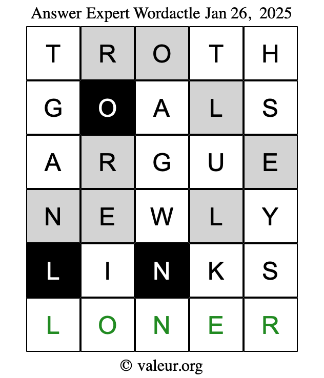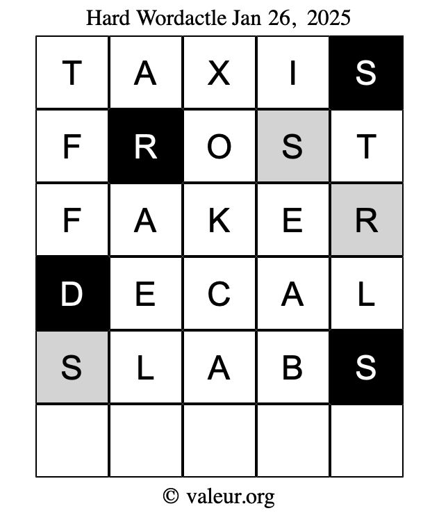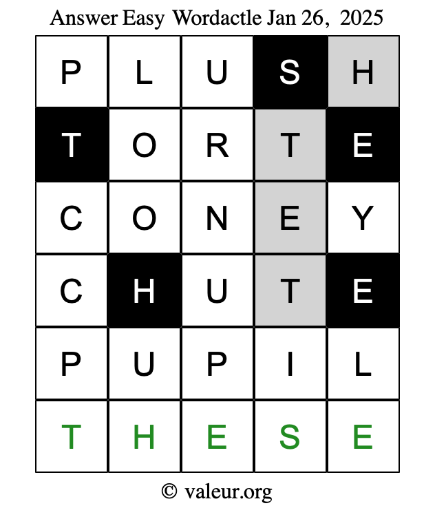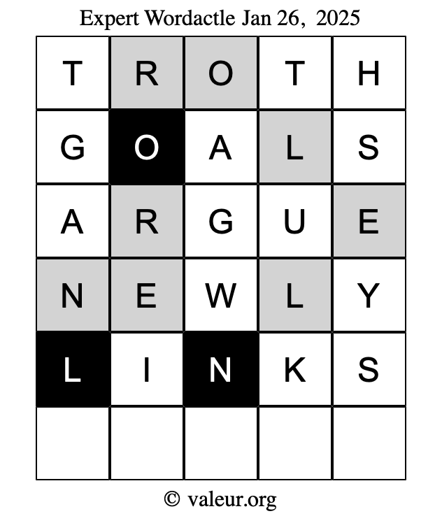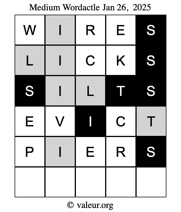 Here are the January 26, 2025 daily four Wordactle puzzles. You are welcome to print a copy of the puzzles and solve them by hand. For your convenience, we have also included the solutions further down the page so you can check your work.