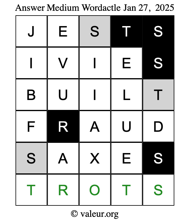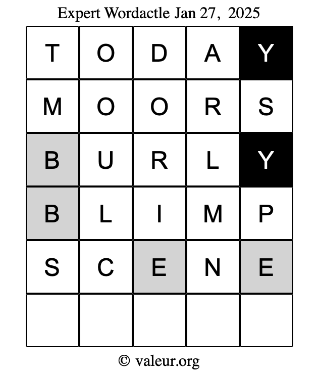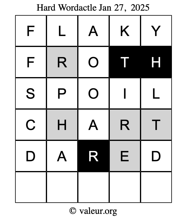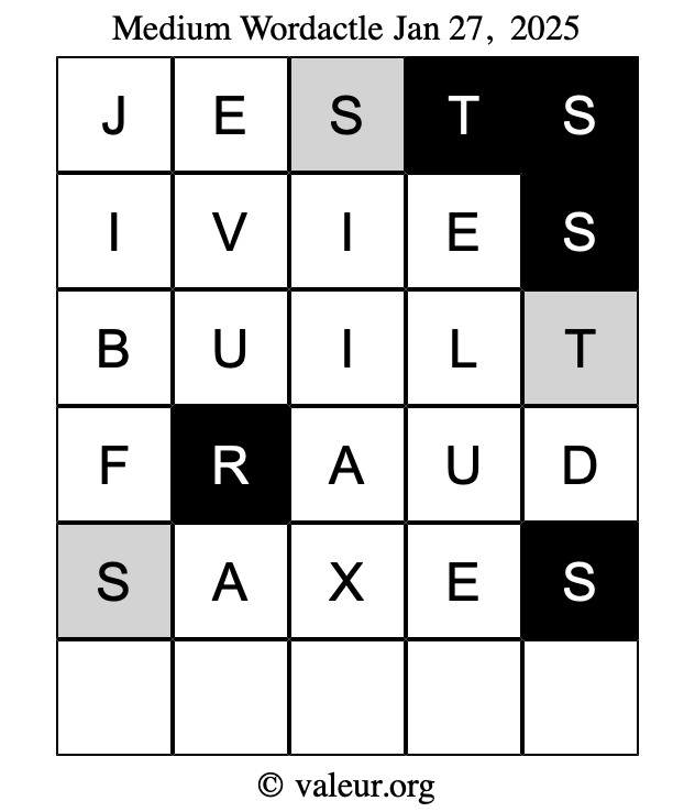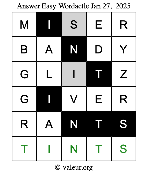 Here are the January 27, 2025 daily four Wordactle puzzles. You are welcome to print a copy of the puzzles and solve them by hand. For your convenience, we have also included the solutions further down the page so you can check your work.