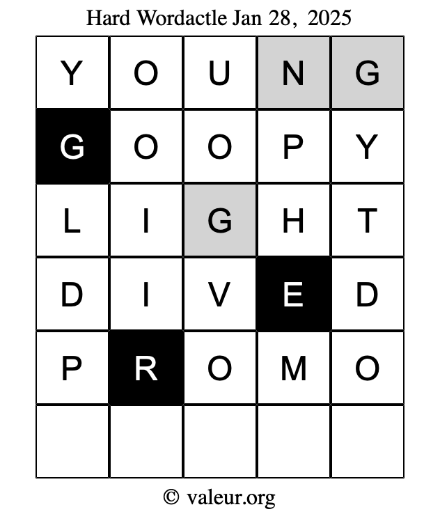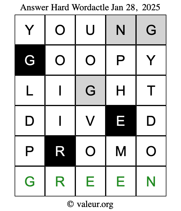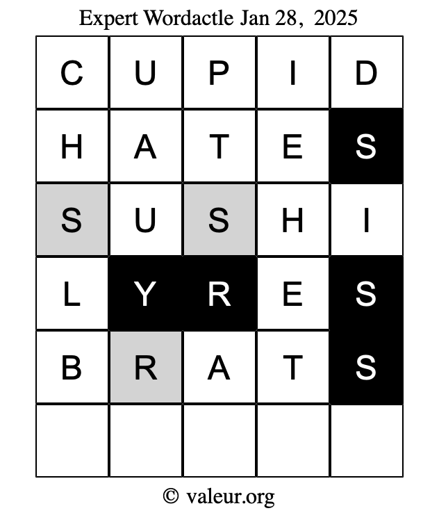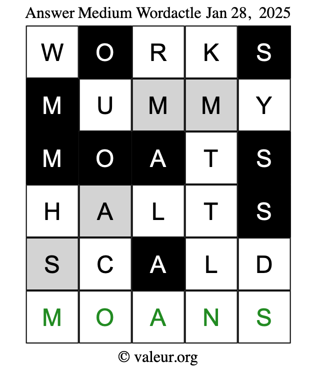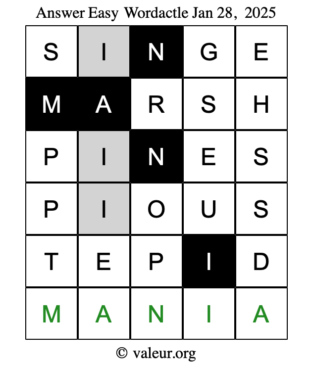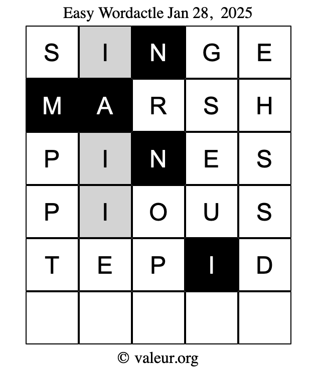 Here are the January 28, 2025 daily four Wordactle puzzles. You are welcome to print a copy of the puzzles and solve them by hand. For your convenience, we have also included the solutions further down the page so you can check your work.
