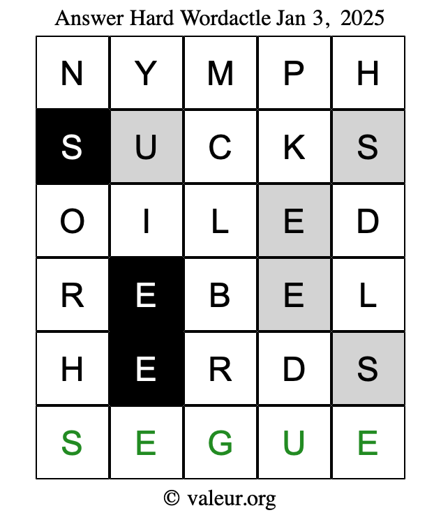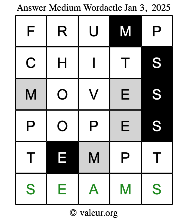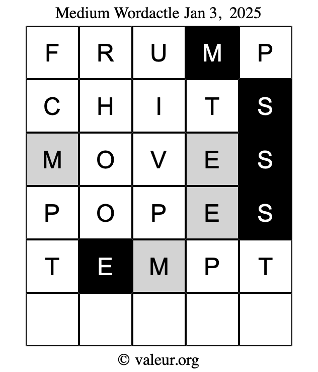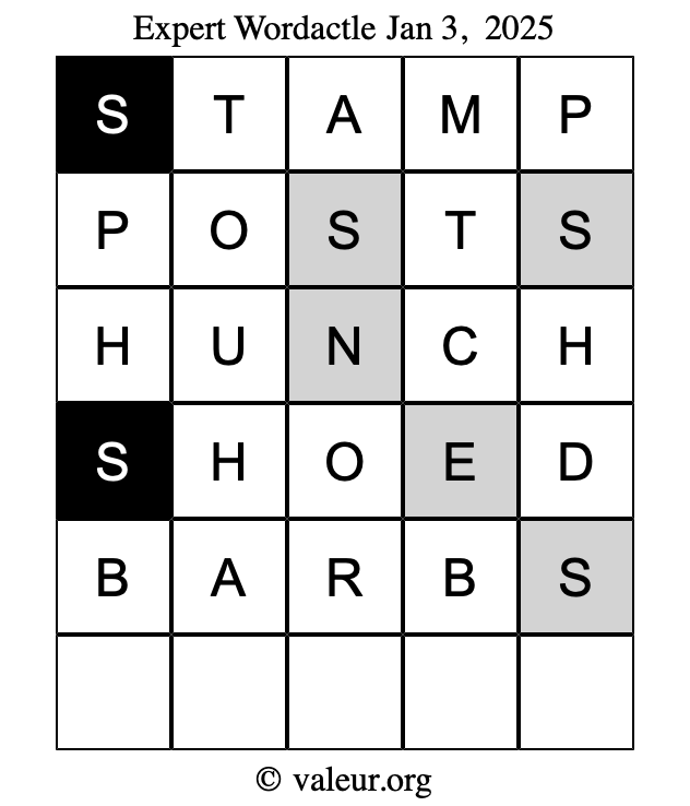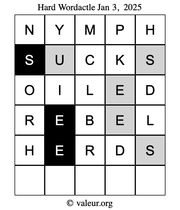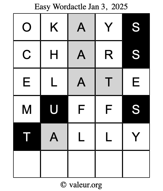 Here are the January 3, 2025 daily four Wordactle puzzles. You are welcome to print a copy of the puzzles and solve them by hand. For your convenience, we have also included the solutions further down the page so you can check your work.