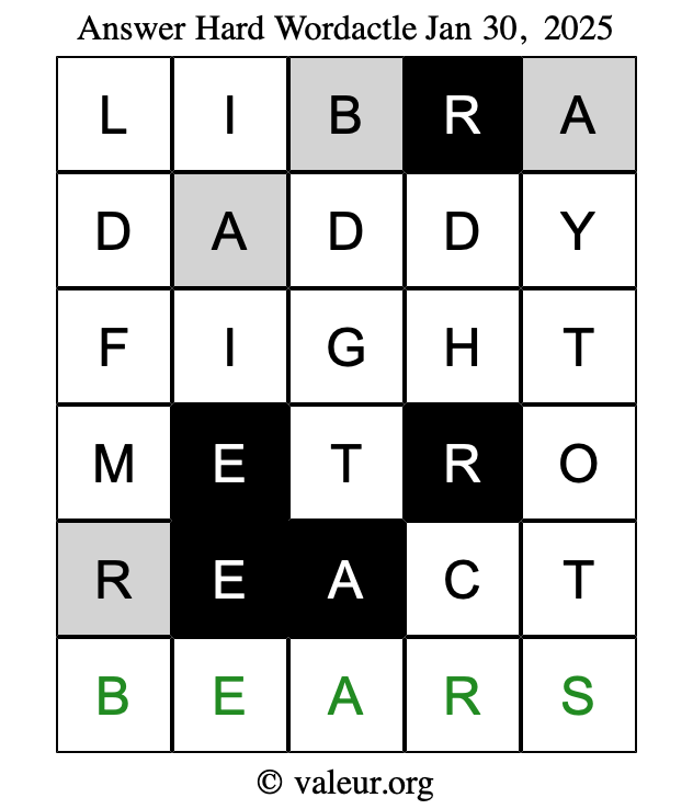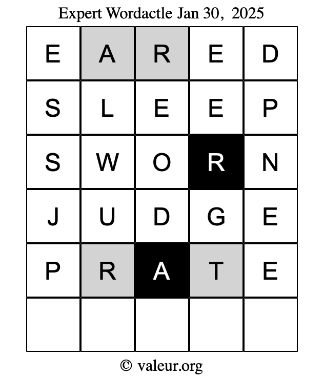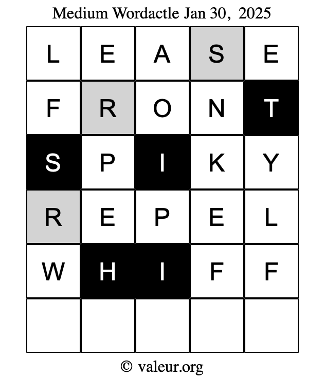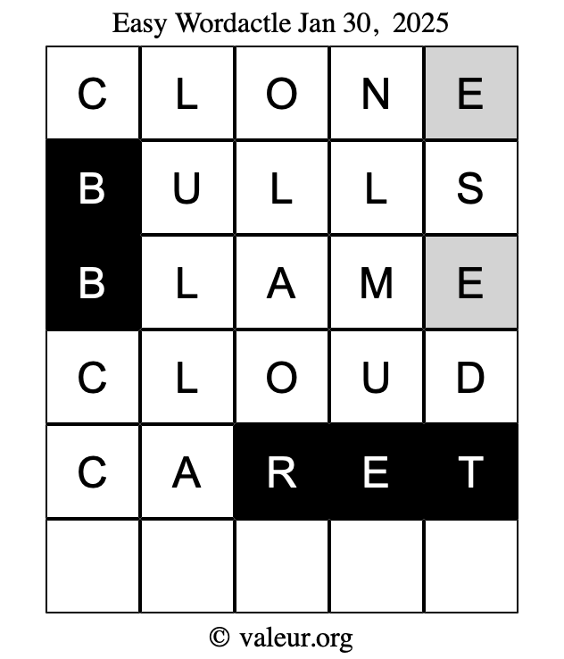 Here are the January 30, 2025 daily four Wordactle puzzles. You are welcome to print a copy of the puzzles and solve them by hand. For your convenience, we have also included the solutions further down the page so you can check your work.
