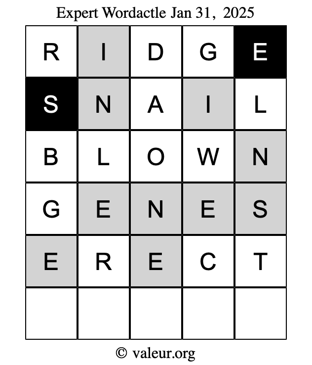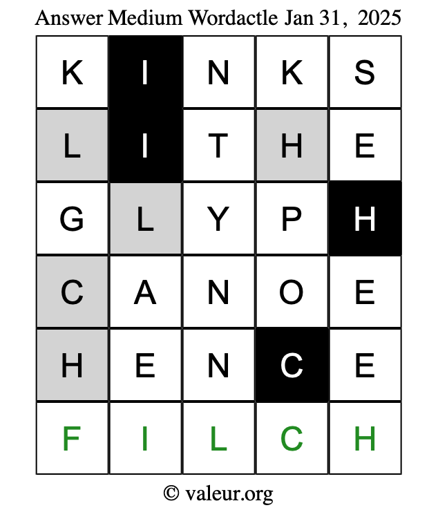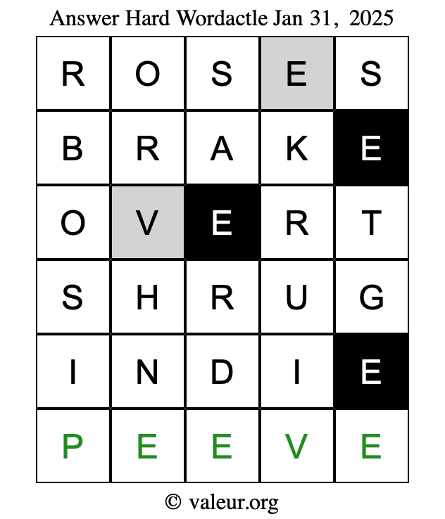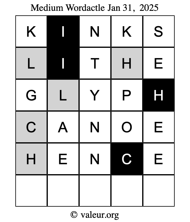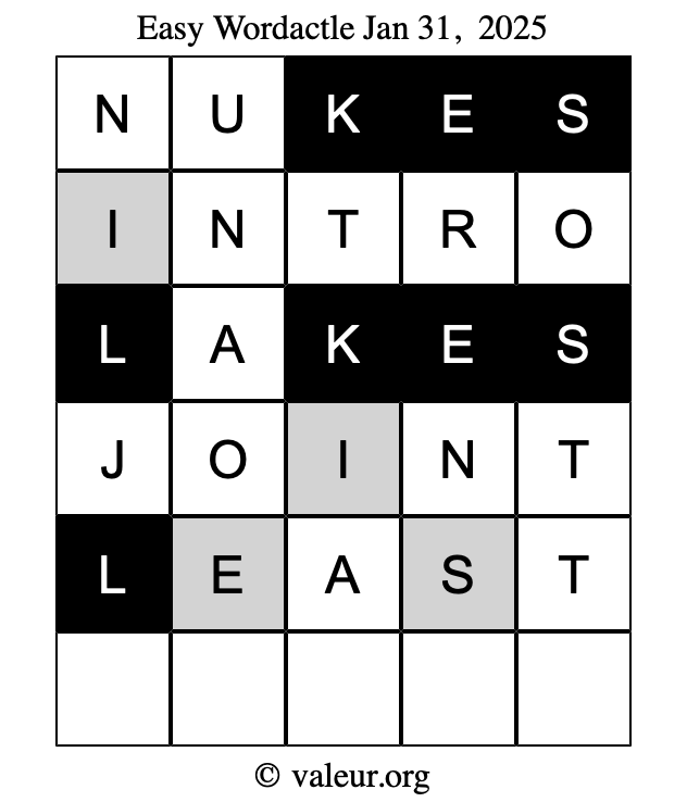 Here are the January 31, 2025 daily four Wordactle puzzles. You are welcome to print a copy of the puzzles and solve them by hand. For your convenience, we have also included the solutions further down the page so you can check your work.