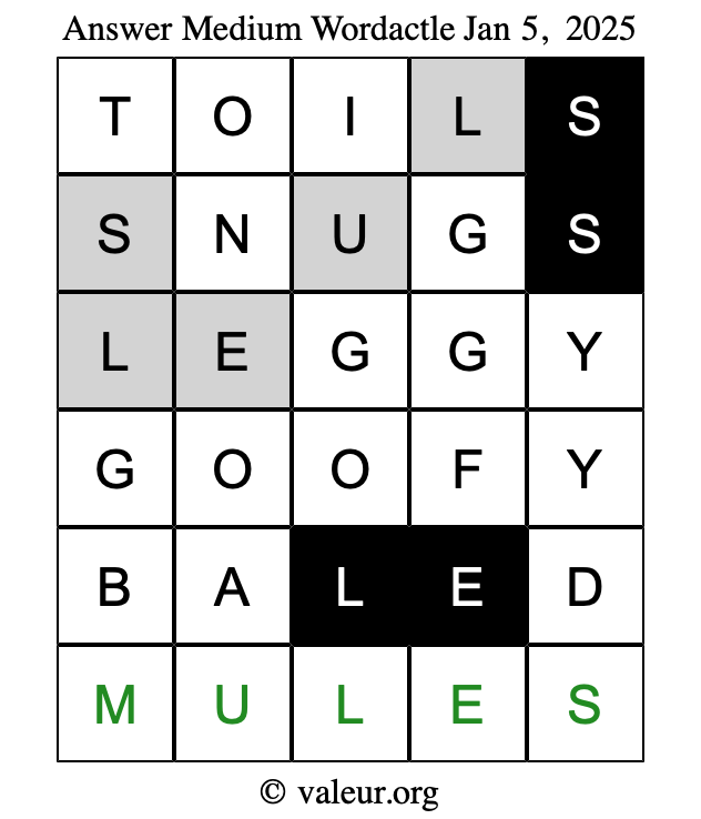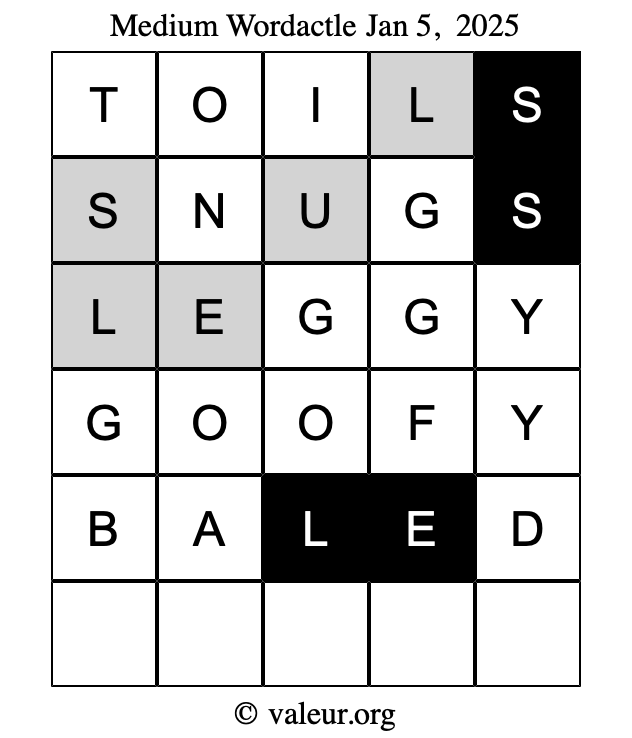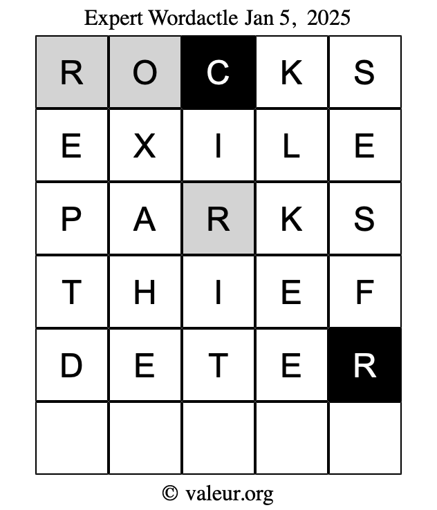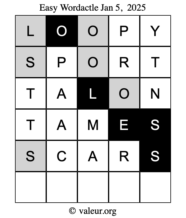 Here are the January 5, 2025 daily four Wordactle puzzles. You are welcome to print a copy of the puzzles and solve them by hand. For your convenience, we have also included the solutions further down the page so you can check your work.