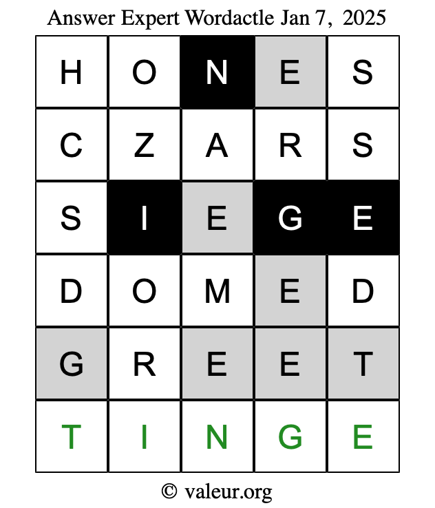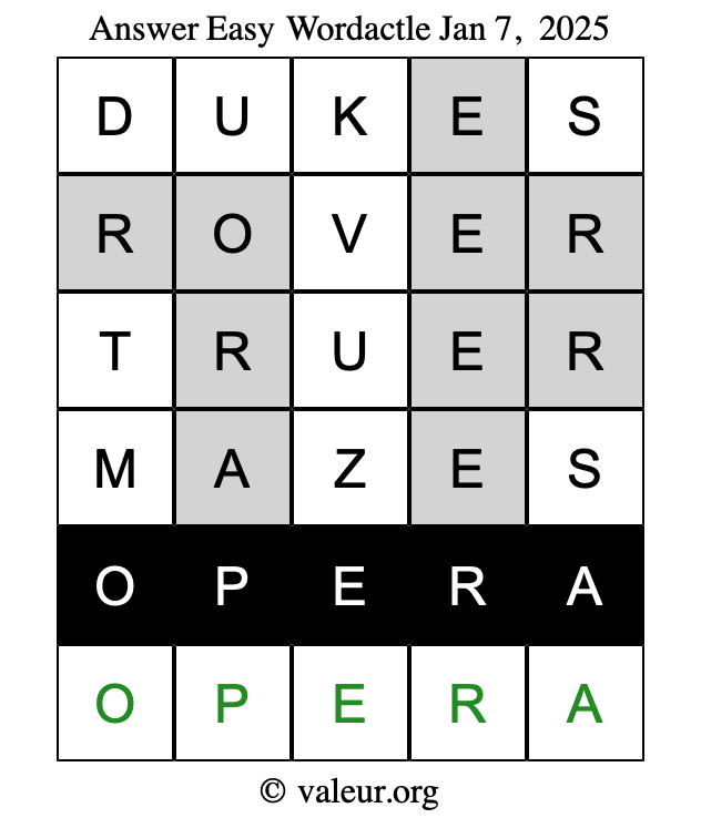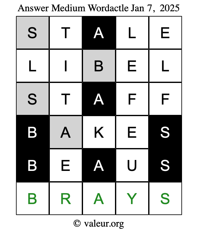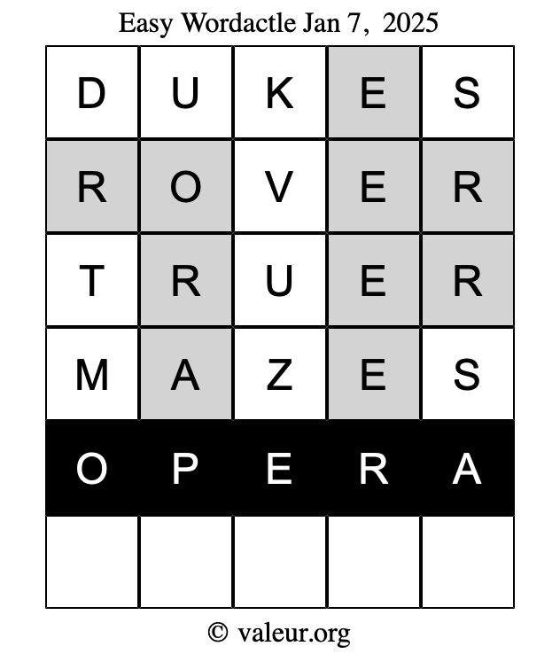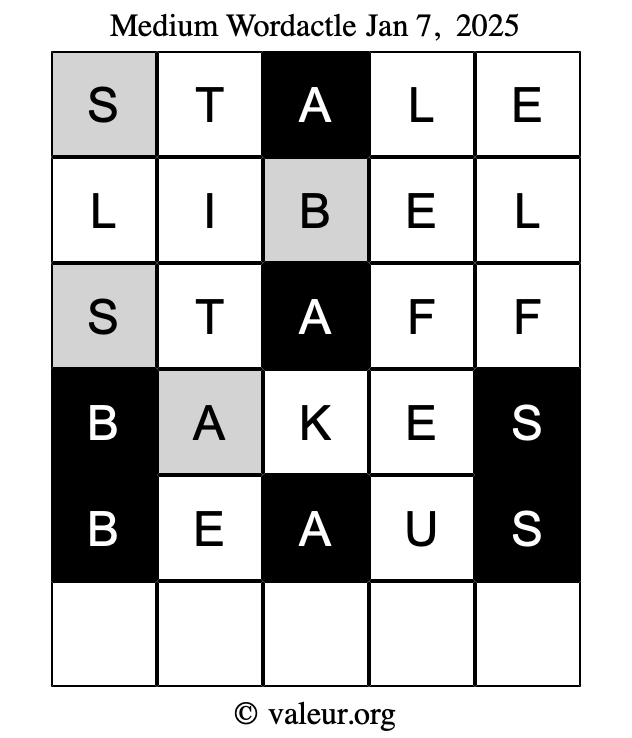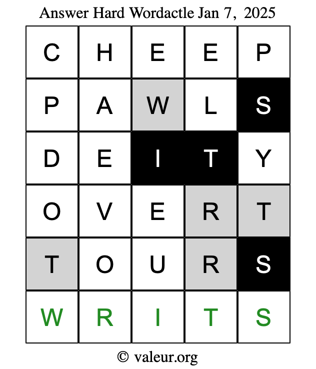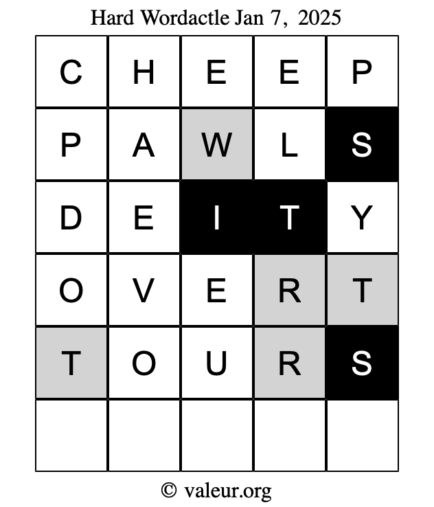 Here are the January 7, 2025 daily four Wordactle puzzles. You are welcome to print a copy of the puzzles and solve them by hand. For your convenience, we have also included the solutions further down the page so you can check your work.