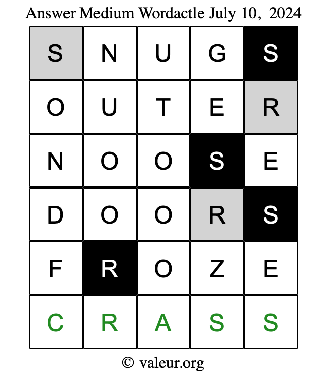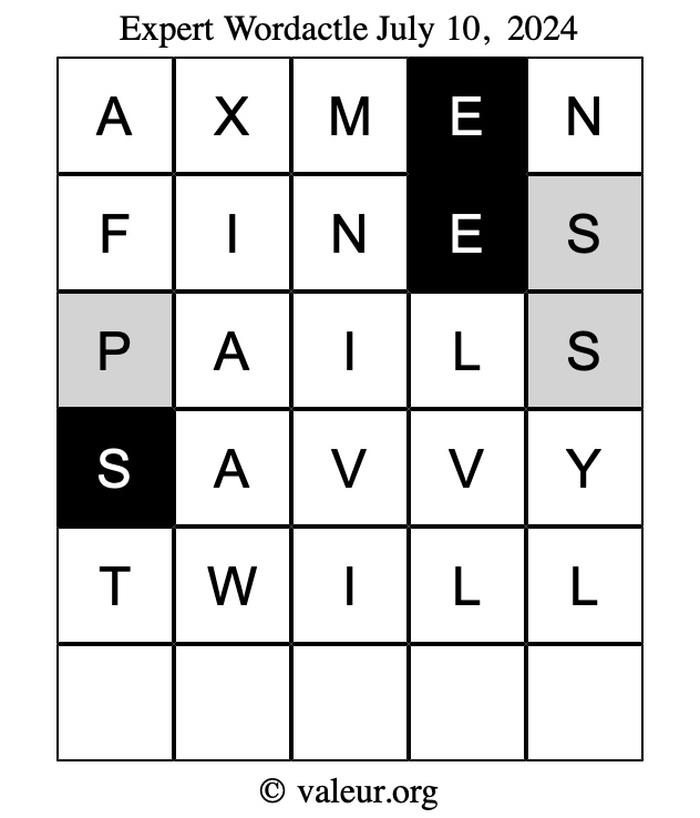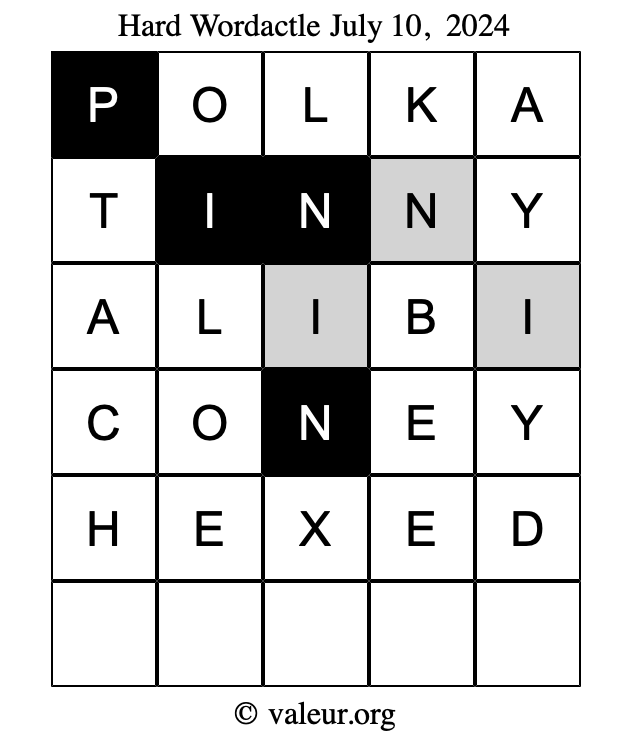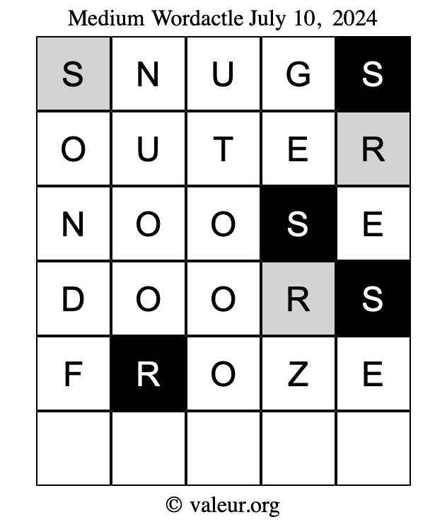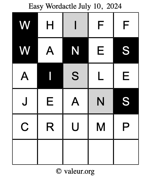 Here are the July 10, 2024 daily four Wordactle puzzles. You are welcome to print a copy of the puzzles and solve them by hand. For your convenience, we have also included the solutions further down the page so you can check your work.