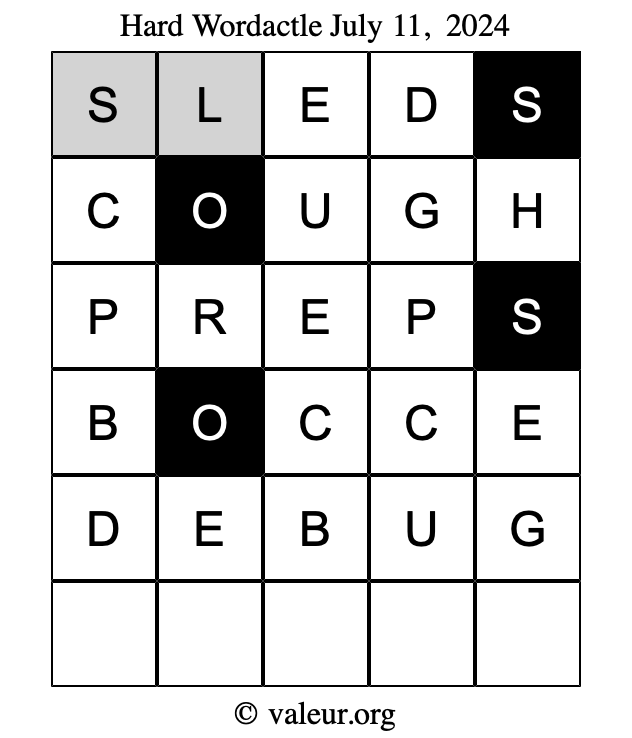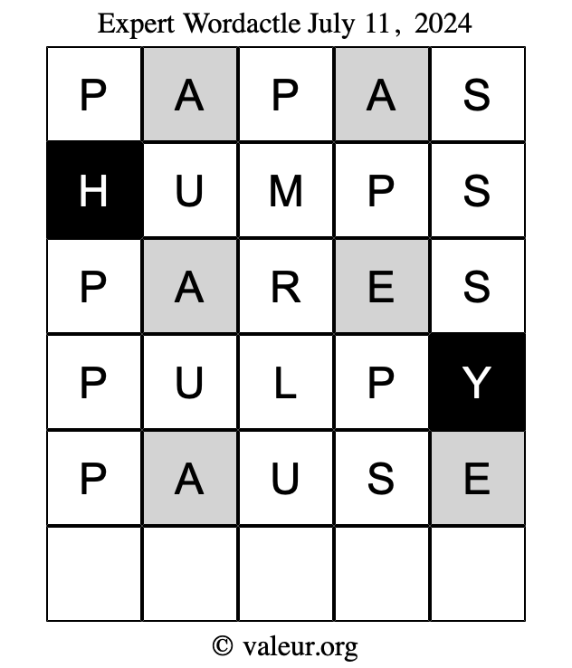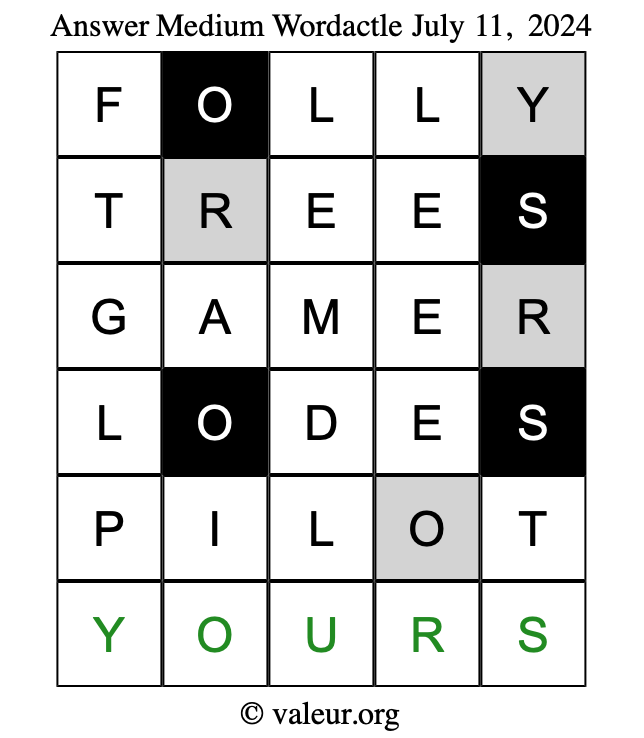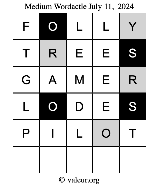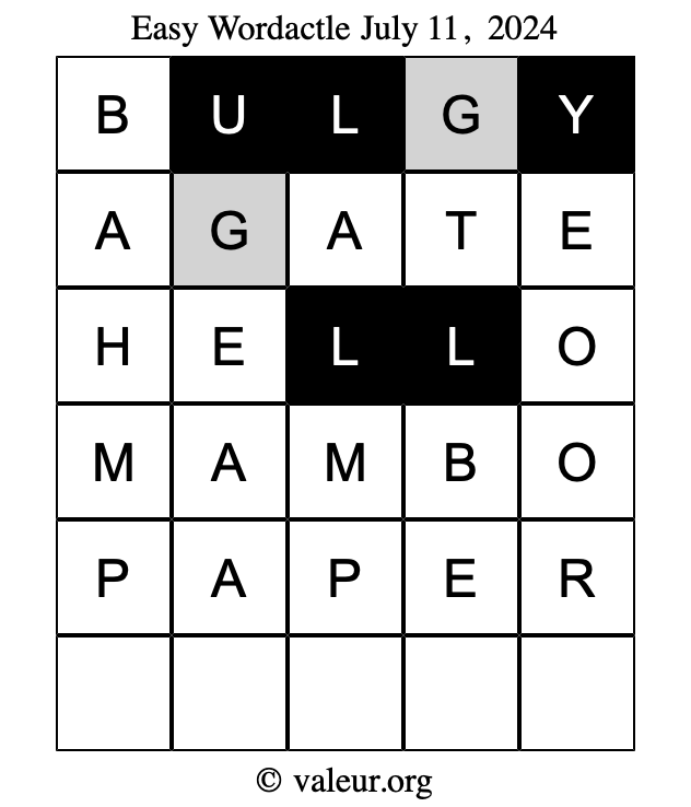 Here are the July 11, 2024 daily four Wordactle puzzles. You are welcome to print a copy of the puzzles and solve them by hand. For your convenience, we have also included the solutions further down the page so you can check your work.
