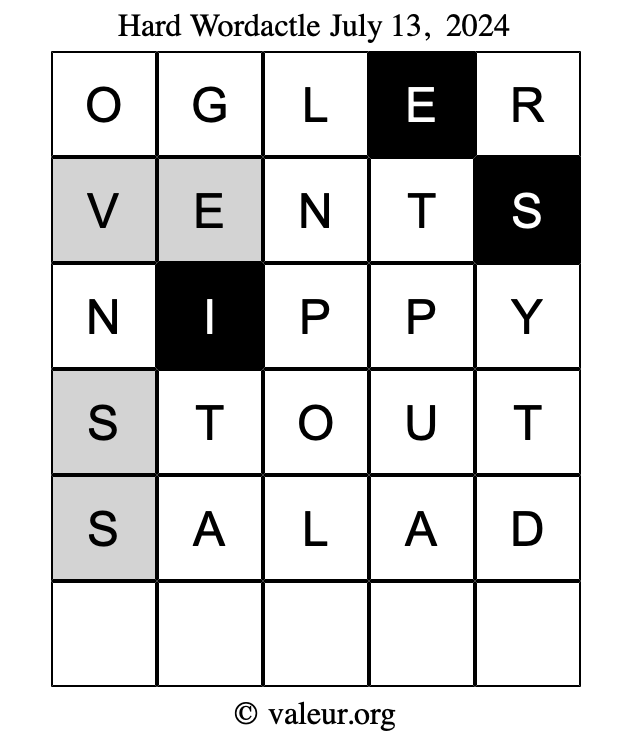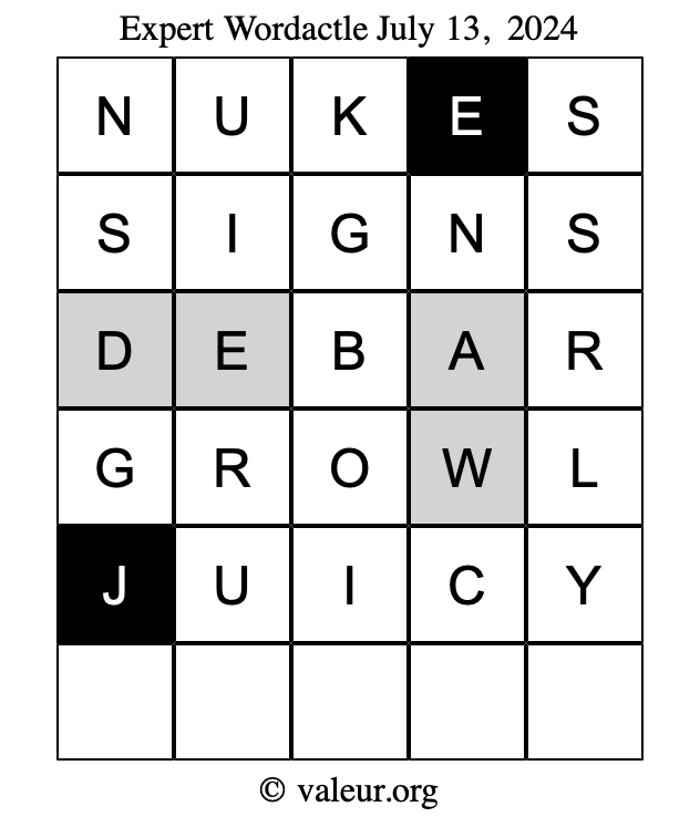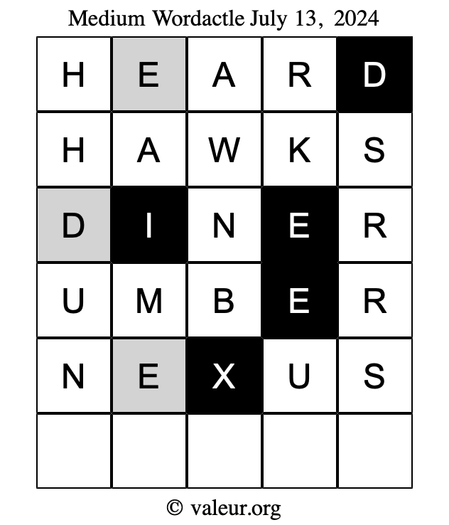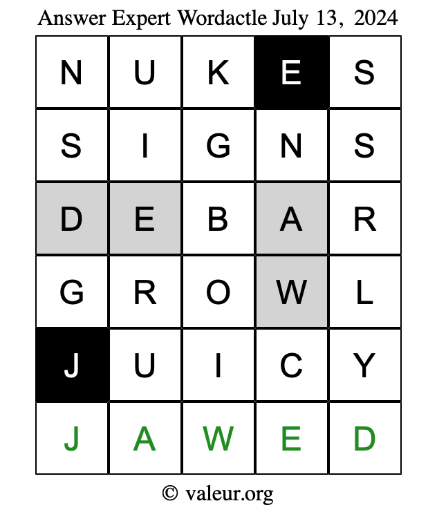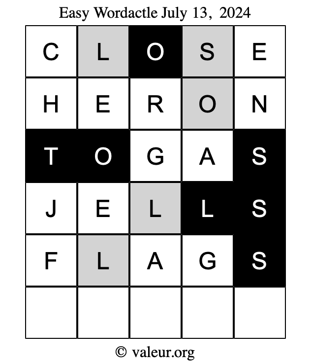 Here are the July 13, 2024 daily four Wordactle puzzles. You are welcome to print a copy of the puzzles and solve them by hand. For your convenience, we have also included the solutions further down the page so you can check your work.
