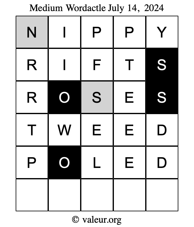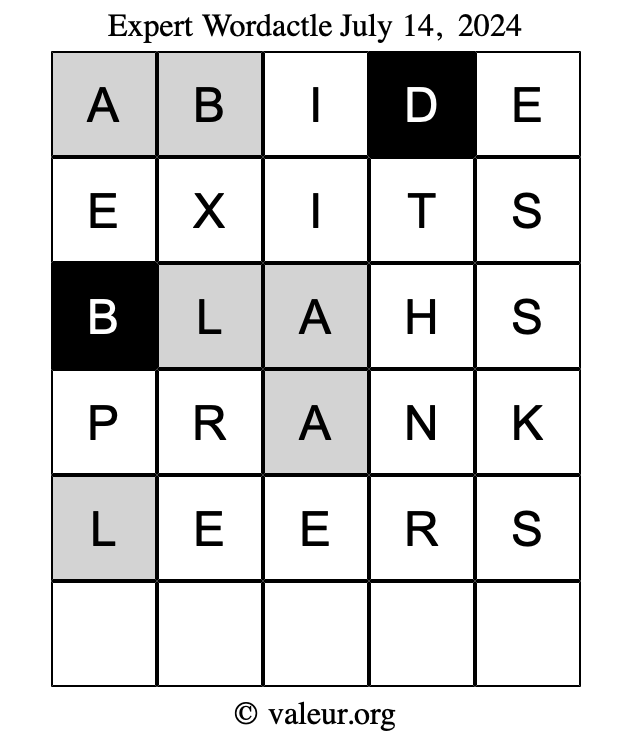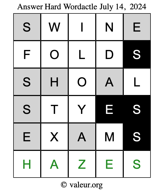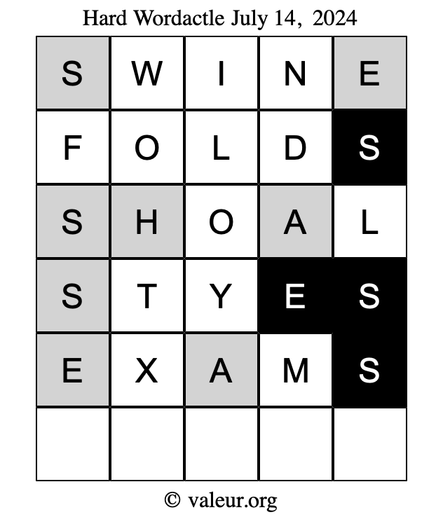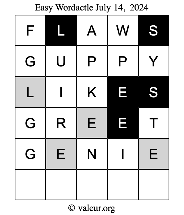 Here are the July 14, 2024 daily four Wordactle puzzles. You are welcome to print a copy of the puzzles and solve them by hand. For your convenience, we have also included the solutions further down the page so you can check your work.
