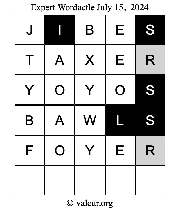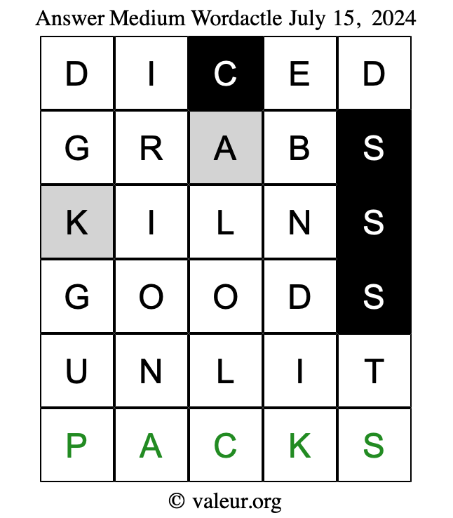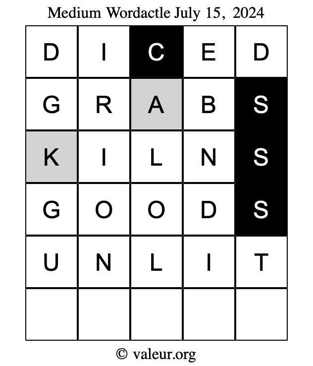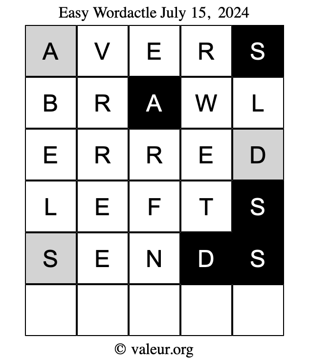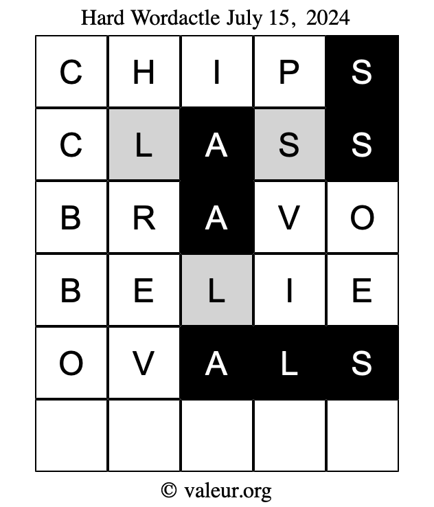 Here are the July 15, 2024 daily four Wordactle puzzles. You are welcome to print a copy of the puzzles and solve them by hand. For your convenience, we have also included the solutions further down the page so you can check your work.