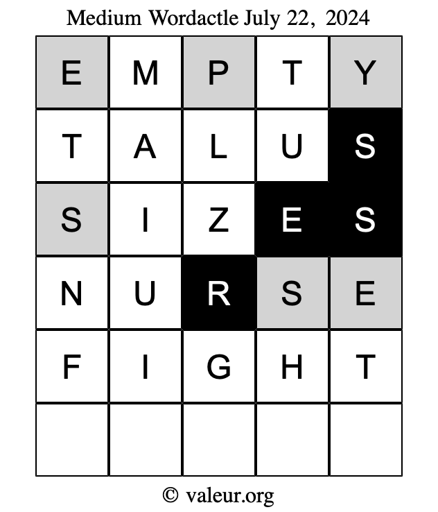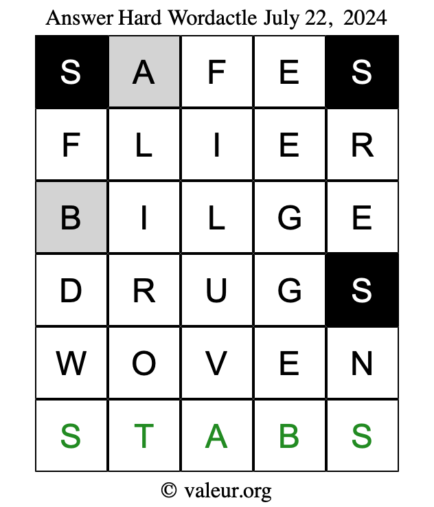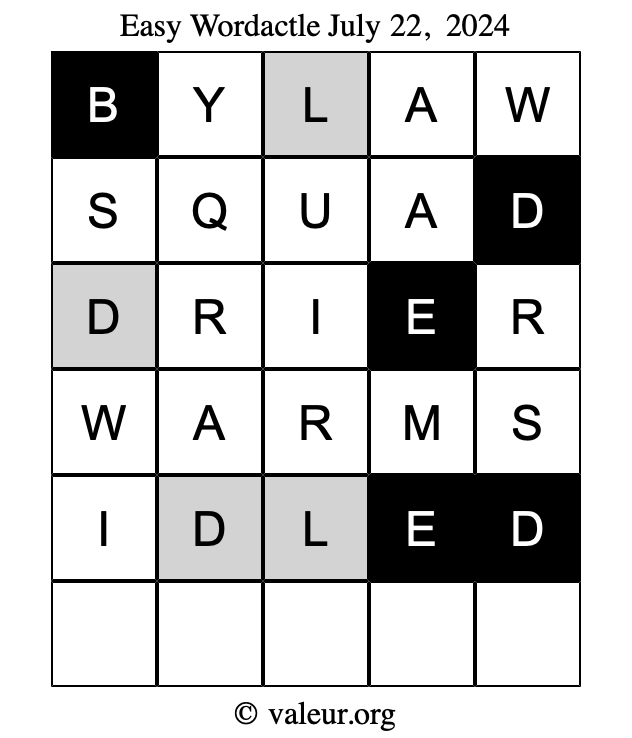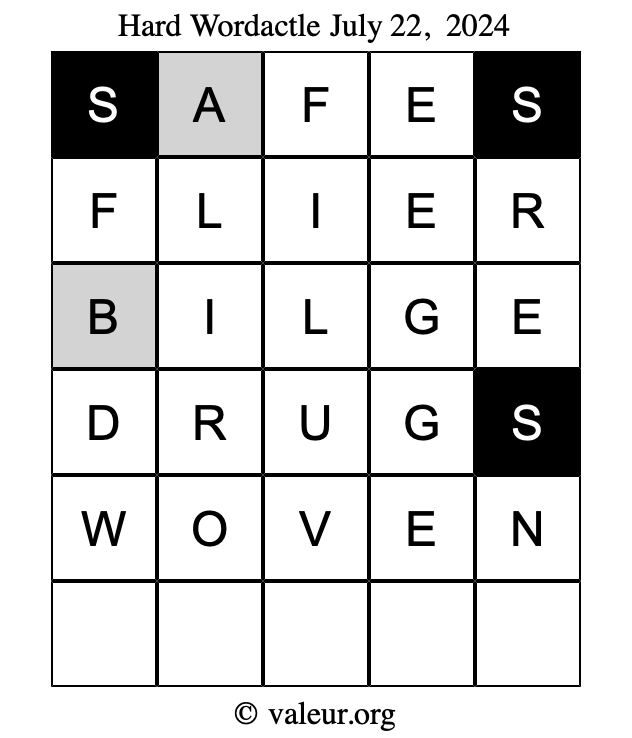 Here are the July 22, 2024 daily four Wordactle puzzles. You are welcome to print a copy of the puzzles and solve them by hand. For your convenience, we have also included the solutions further down the page so you can check your work.