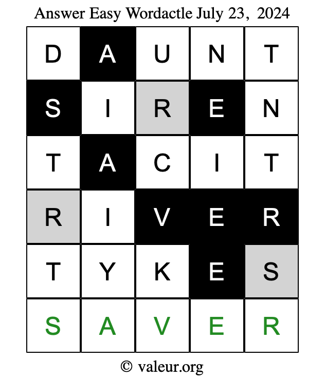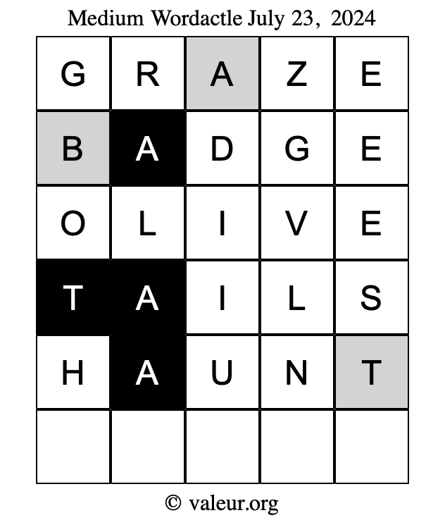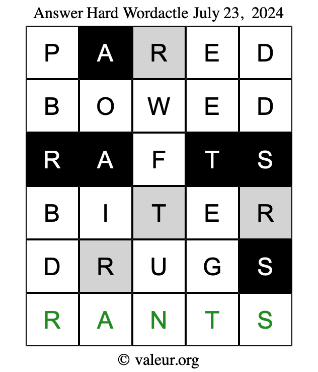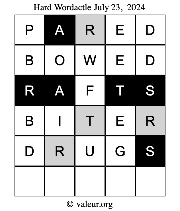 Here are the July 23, 2024 daily four Wordactle puzzles. You are welcome to print a copy of the puzzles and solve them by hand. For your convenience, we have also included the solutions further down the page so you can check your work.