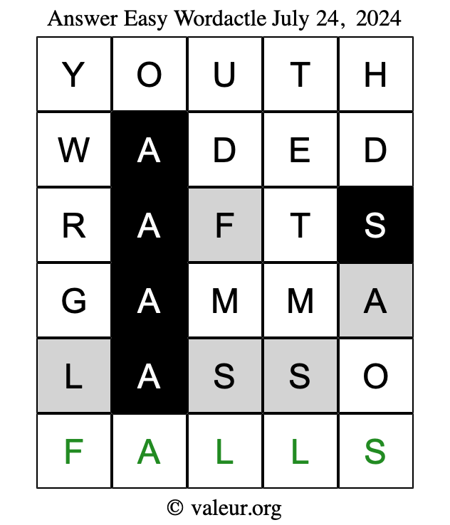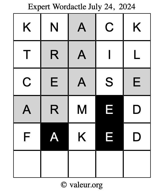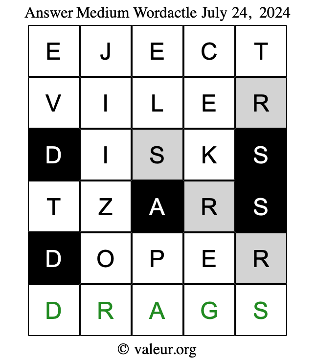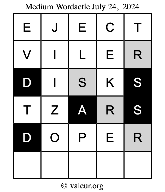 Here are the July 24, 2024 daily four Wordactle puzzles. You are welcome to print a copy of the puzzles and solve them by hand. For your convenience, we have also included the solutions further down the page so you can check your work.