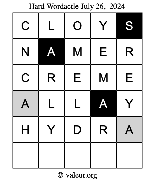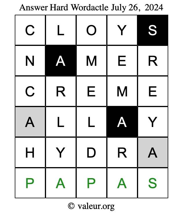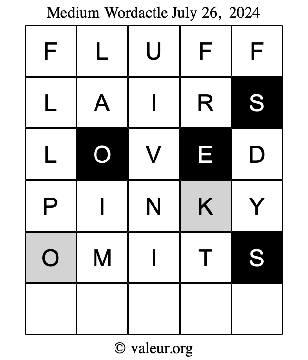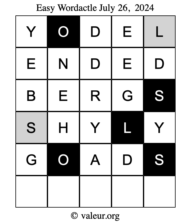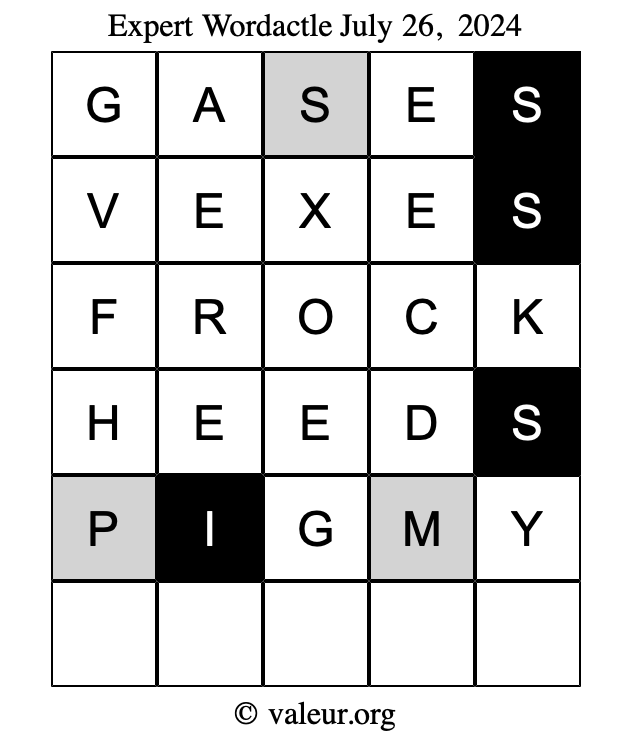 Here are the July 26, 2024 daily four Wordactle puzzles. You are welcome to print a copy of the puzzles and solve them by hand. For your convenience, we have also included the solutions further down the page so you can check your work.