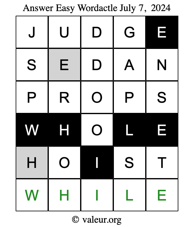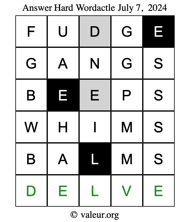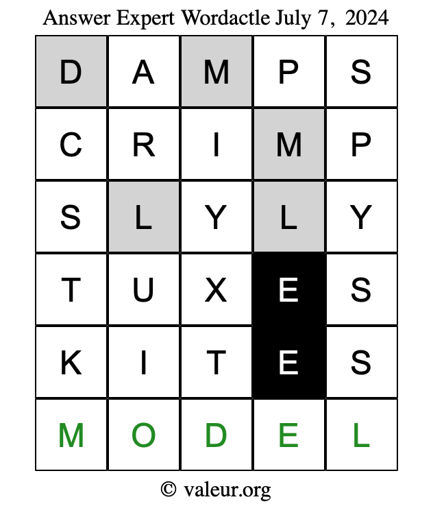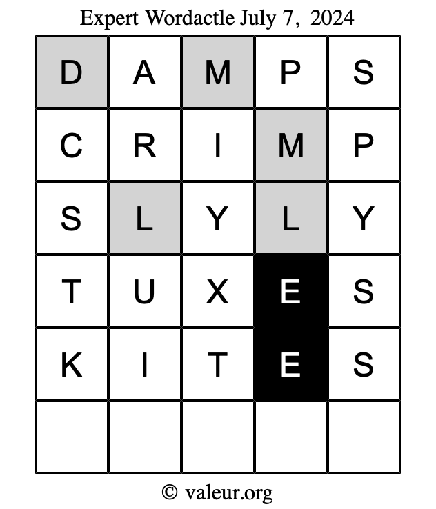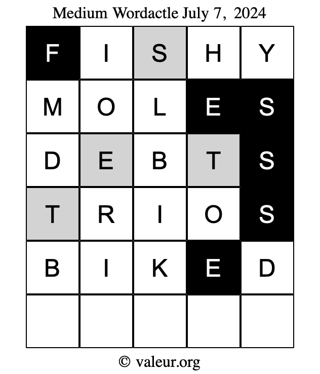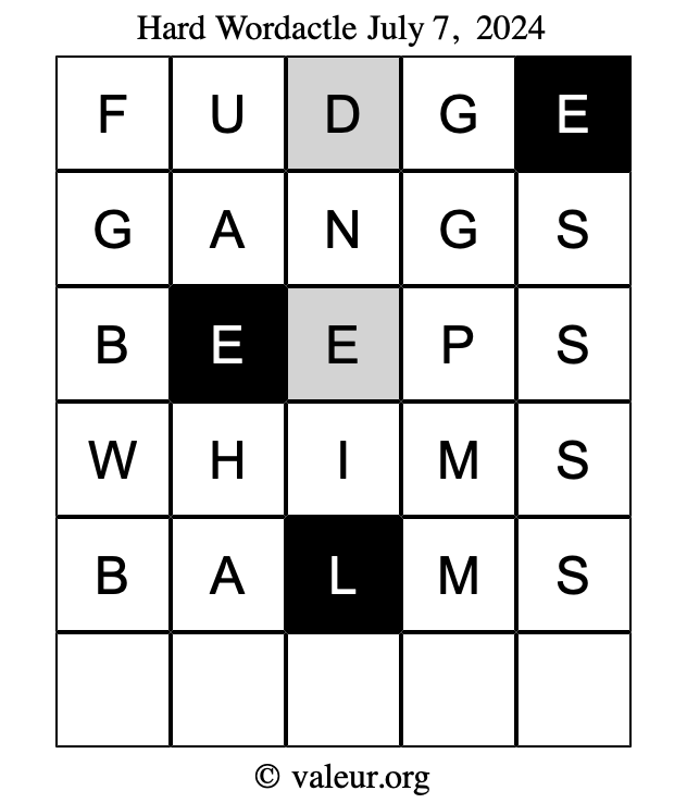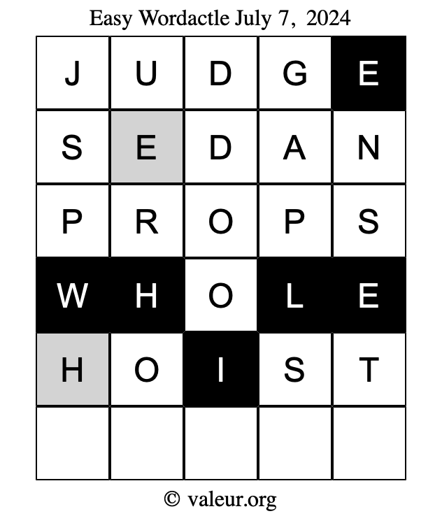 Here are the July 7, 2024 daily four Wordactle puzzles. You are welcome to print a copy of the puzzles and solve them by hand. For your convenience, we have also included the solutions further down the page so you can check your work.