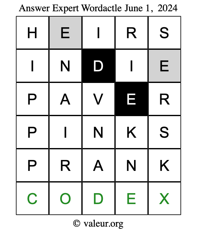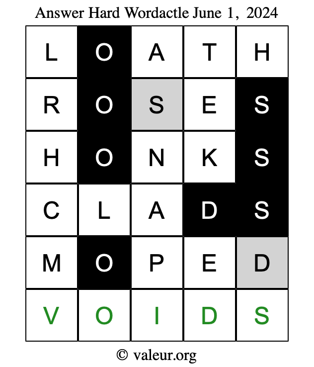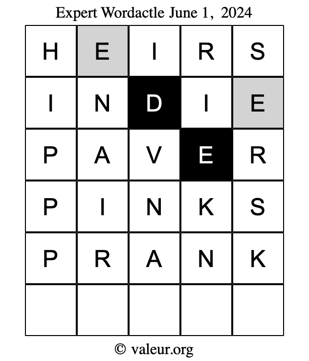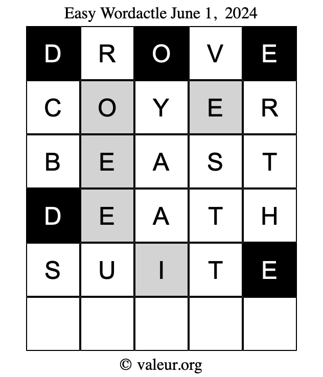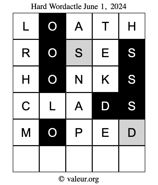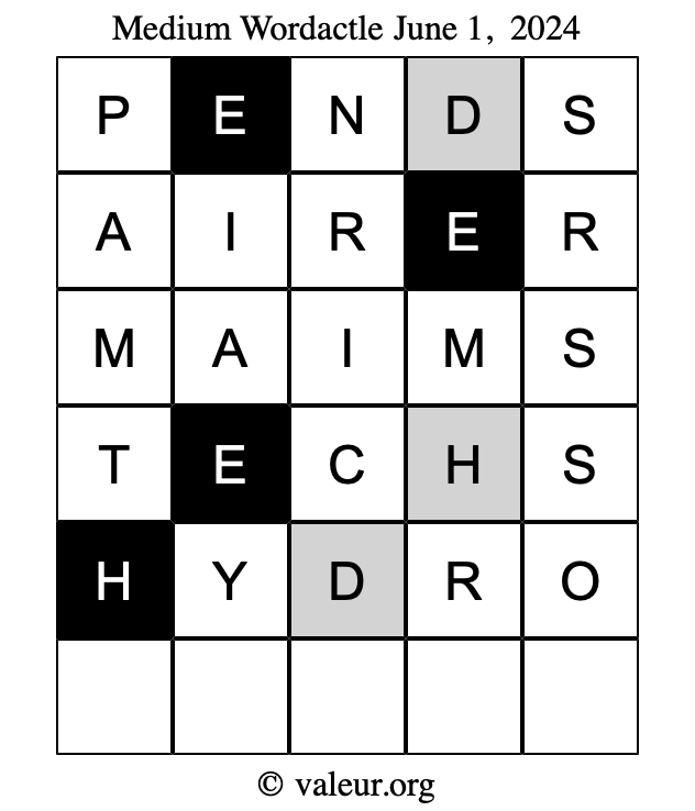 Here are the June 1, 2024 daily four Wordactle puzzles. You are welcome to print a copy of the puzzles and solve them by hand. For your convenience, we have also included the solutions further down the page so you can check your work.