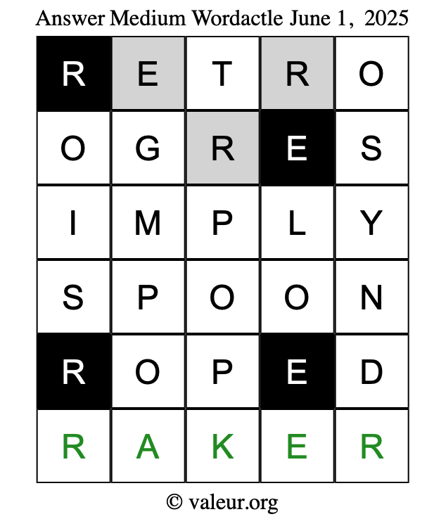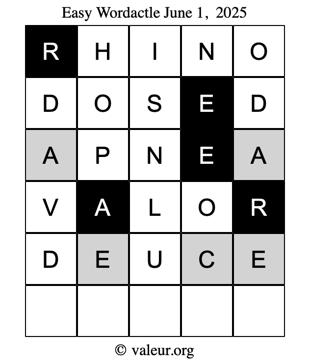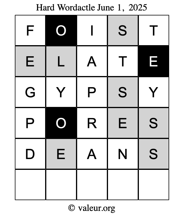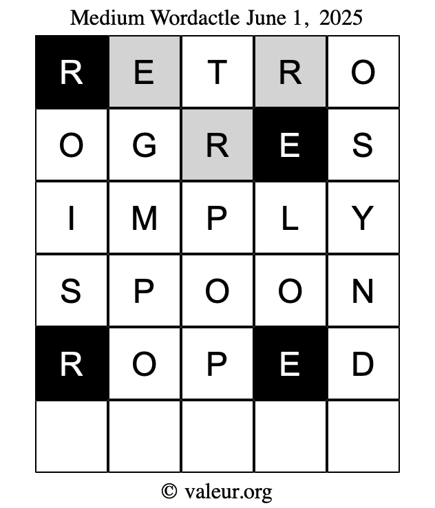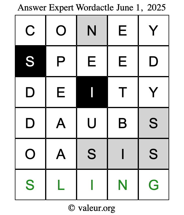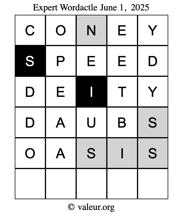 Here are the June 1, 2025 daily four Wordactle puzzles. You are welcome to print a copy of the puzzles and solve them by hand. For your convenience, we have also included the solutions further down the page so you can check your work.
