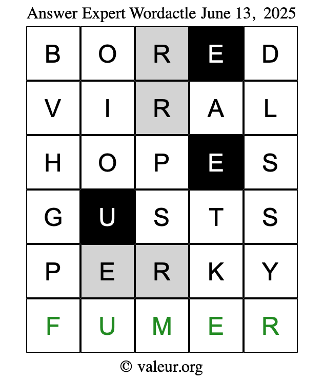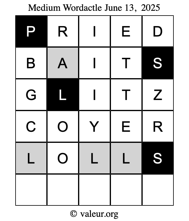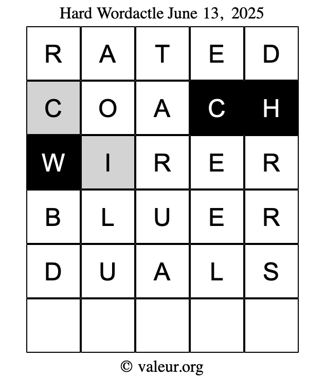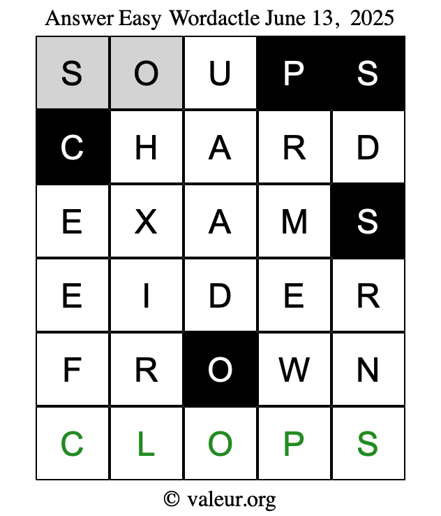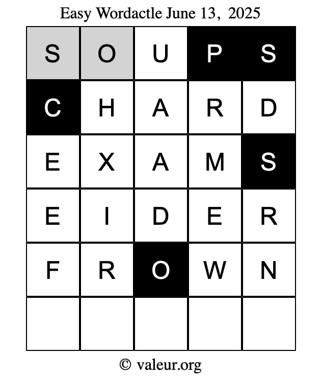 Here are the June 13, 2025 daily four Wordactle puzzles. You are welcome to print a copy of the puzzles and solve them by hand. For your convenience, we have also included the solutions further down the page so you can check your work.