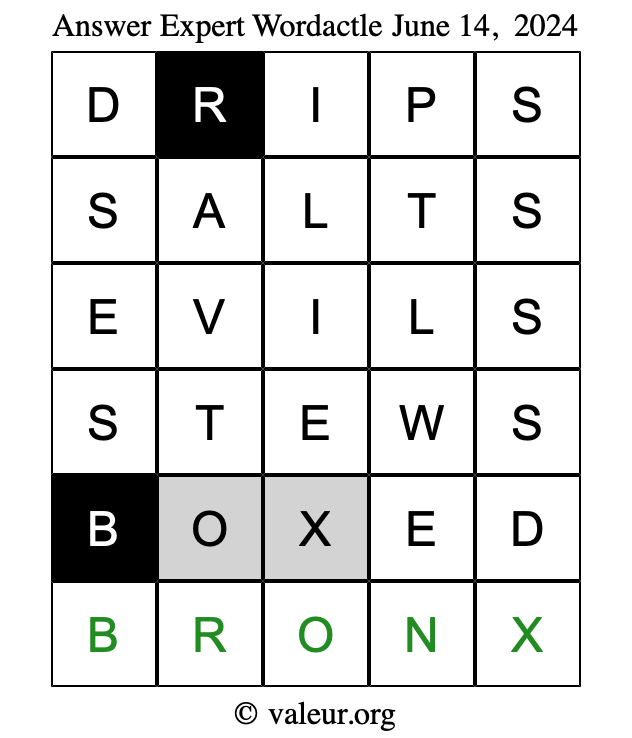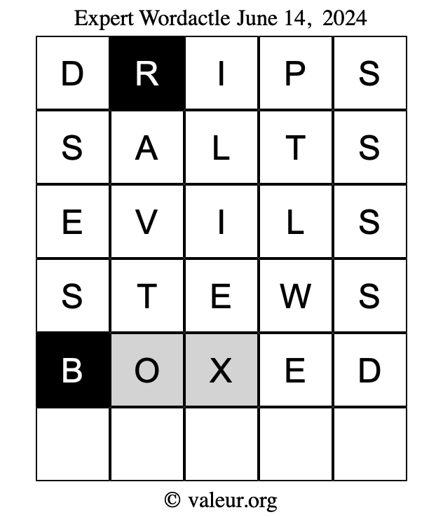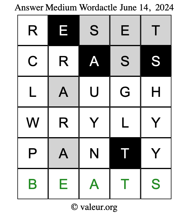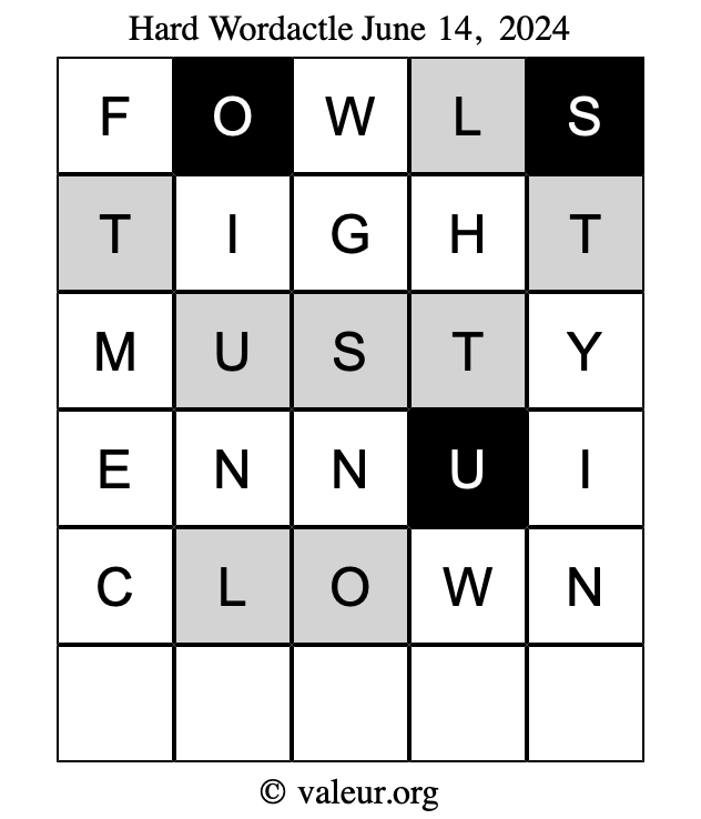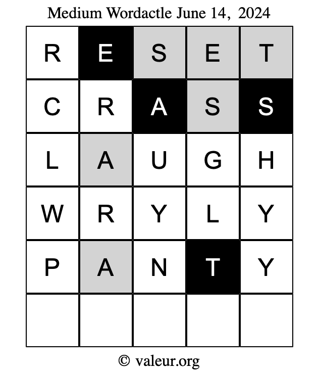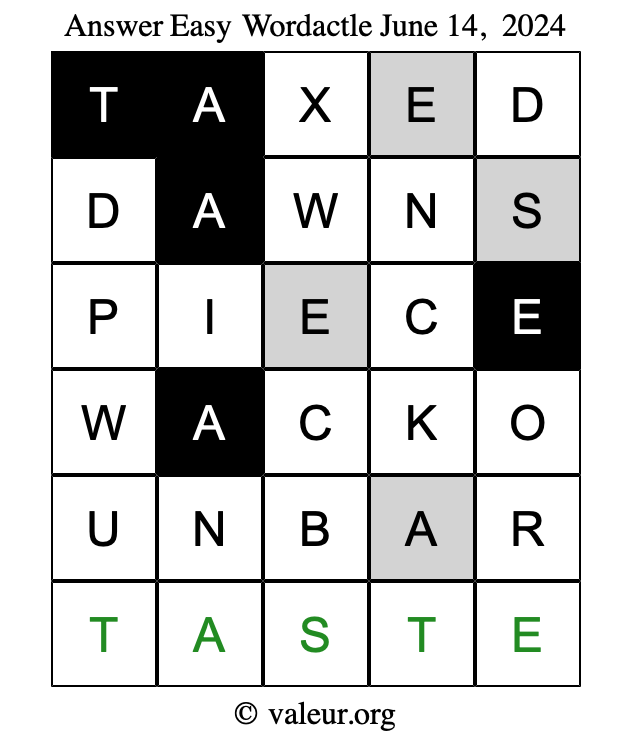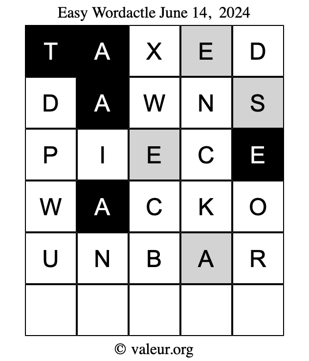 Here are the June 14, 2024 daily four Wordactle puzzles. You are welcome to print a copy of the puzzles and solve them by hand. For your convenience, we have also included the solutions further down the page so you can check your work.