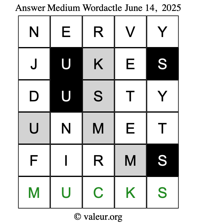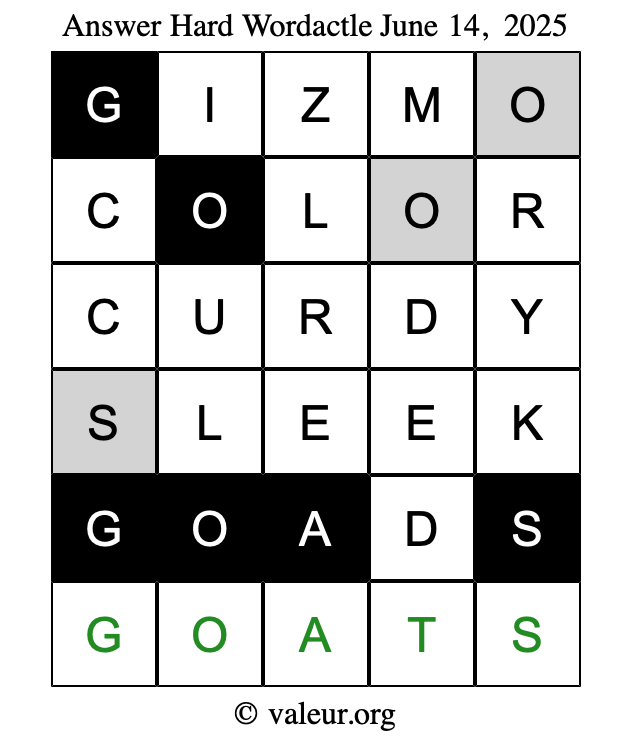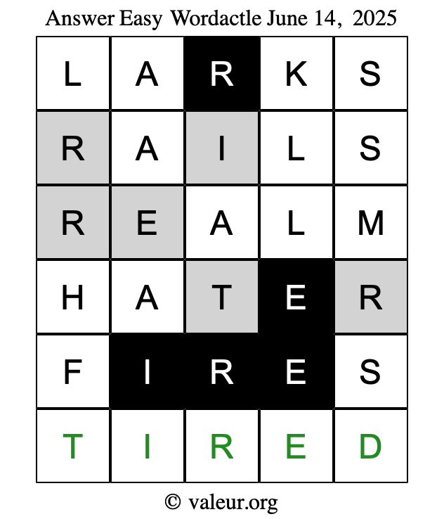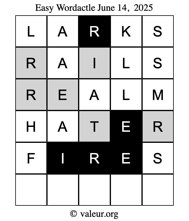 Here are the June 14, 2025 daily four Wordactle puzzles. You are welcome to print a copy of the puzzles and solve them by hand. For your convenience, we have also included the solutions further down the page so you can check your work.