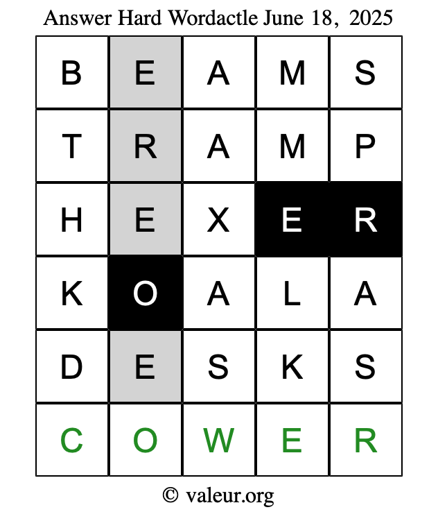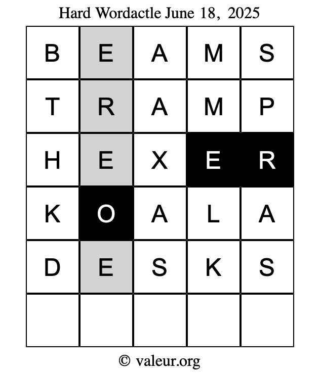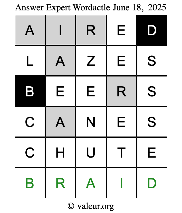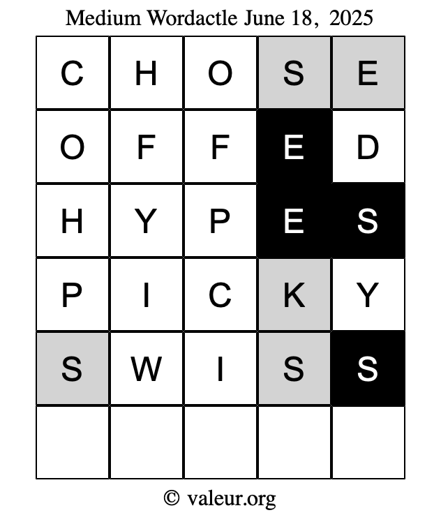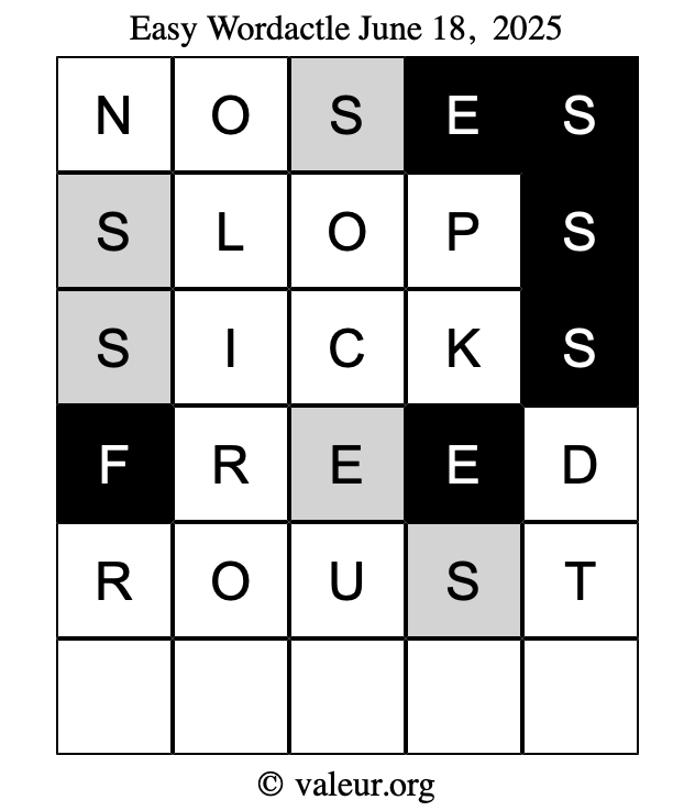 Here are the June 18, 2025 daily four Wordactle puzzles. You are welcome to print a copy of the puzzles and solve them by hand. For your convenience, we have also included the solutions further down the page so you can check your work.