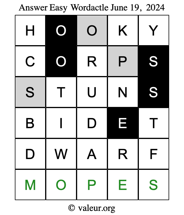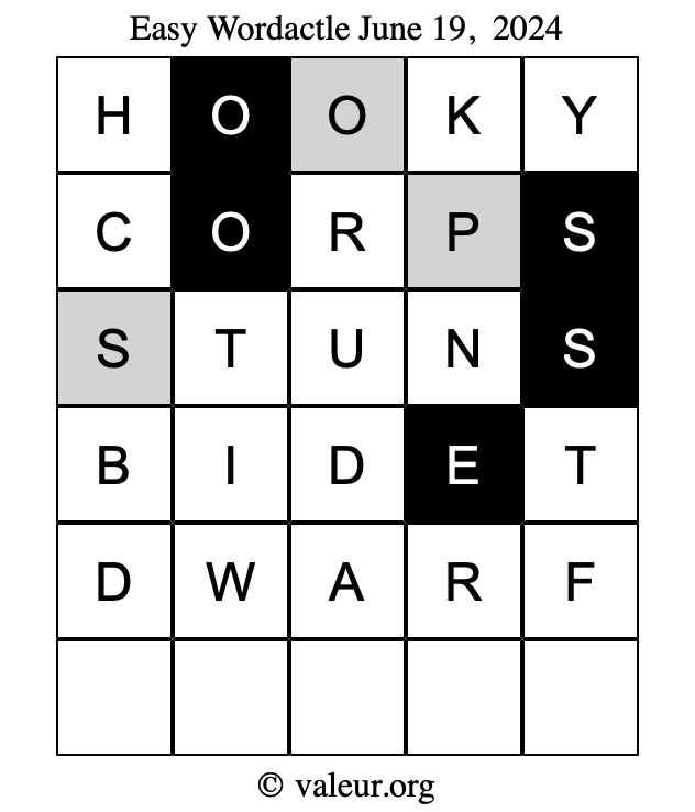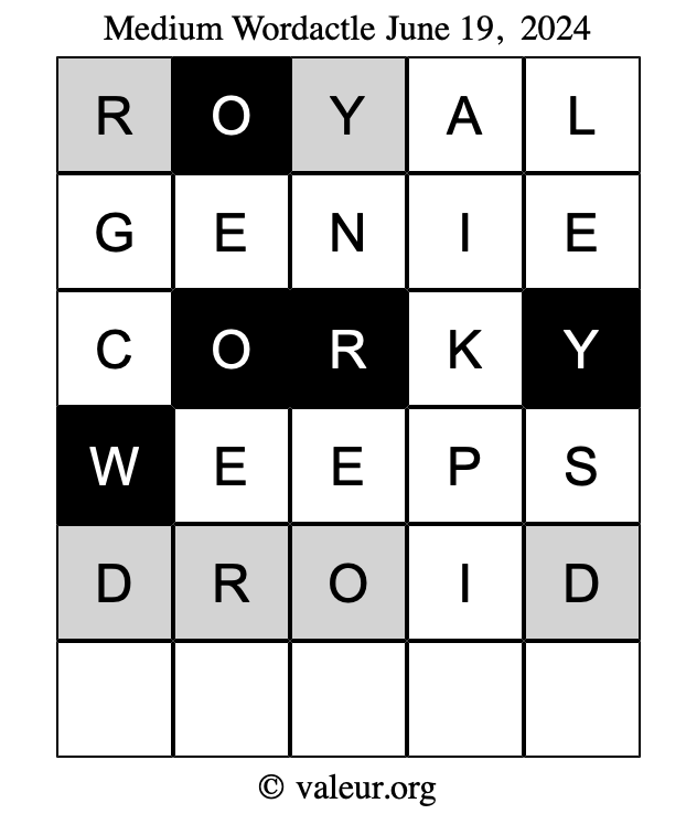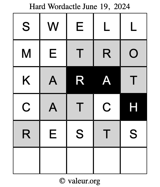 Here are the June 19, 2024 daily four Wordactle puzzles. You are welcome to print a copy of the puzzles and solve them by hand. For your convenience, we have also included the solutions further down the page so you can check your work.