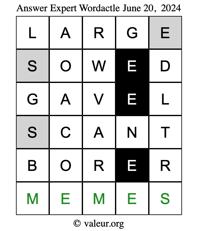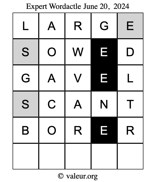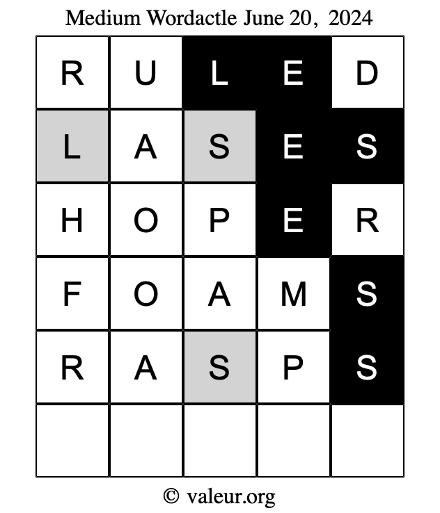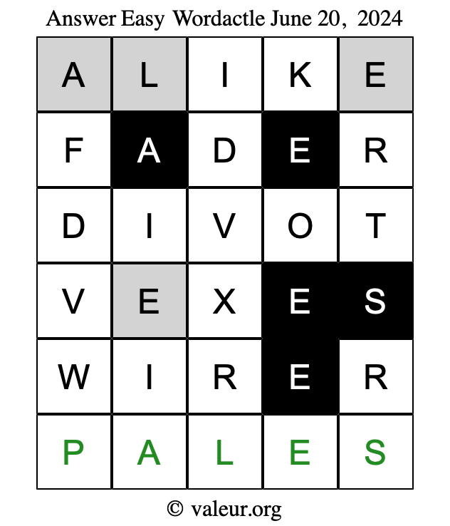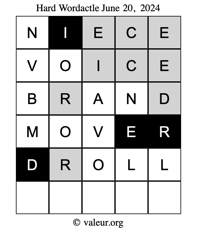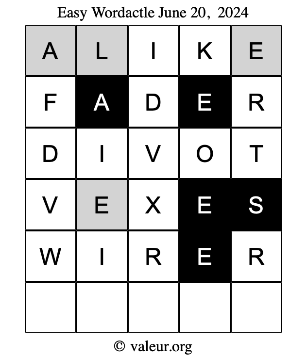 Here are the June 20, 2024 daily four Wordactle puzzles. You are welcome to print a copy of the puzzles and solve them by hand. For your convenience, we have also included the solutions further down the page so you can check your work.