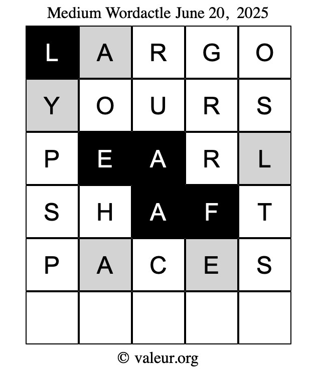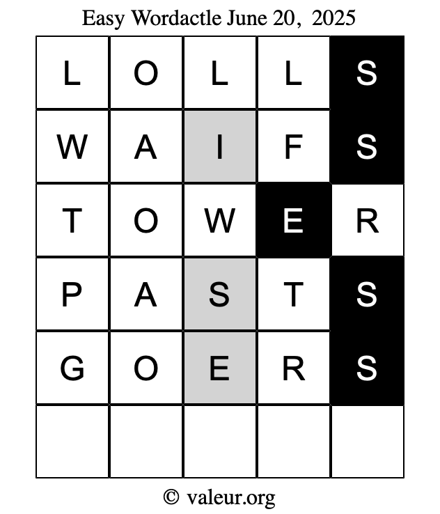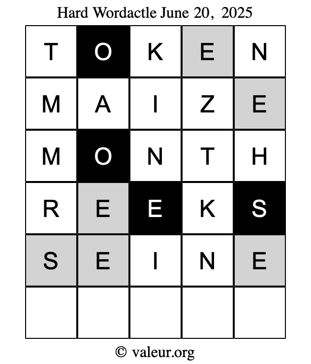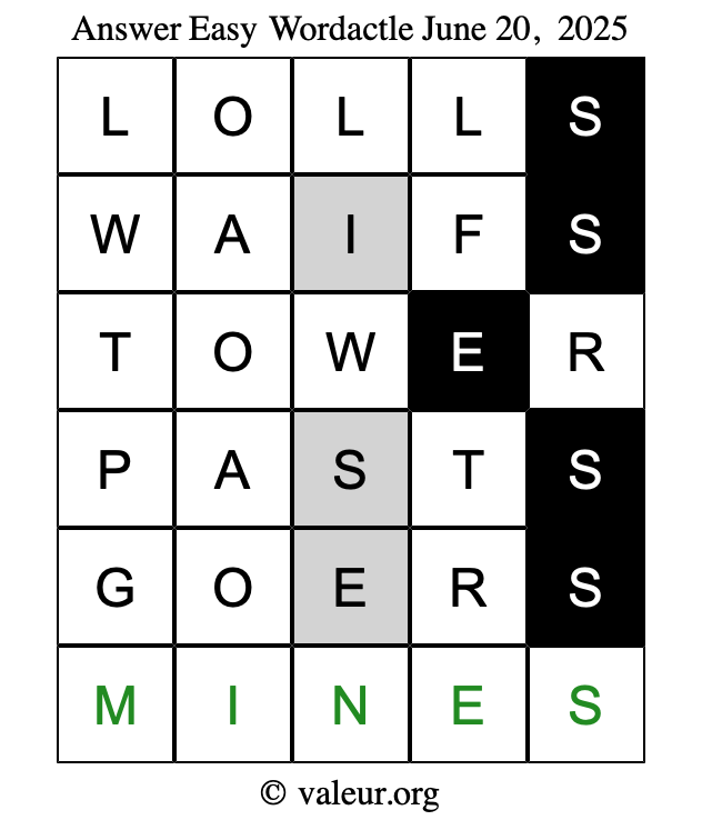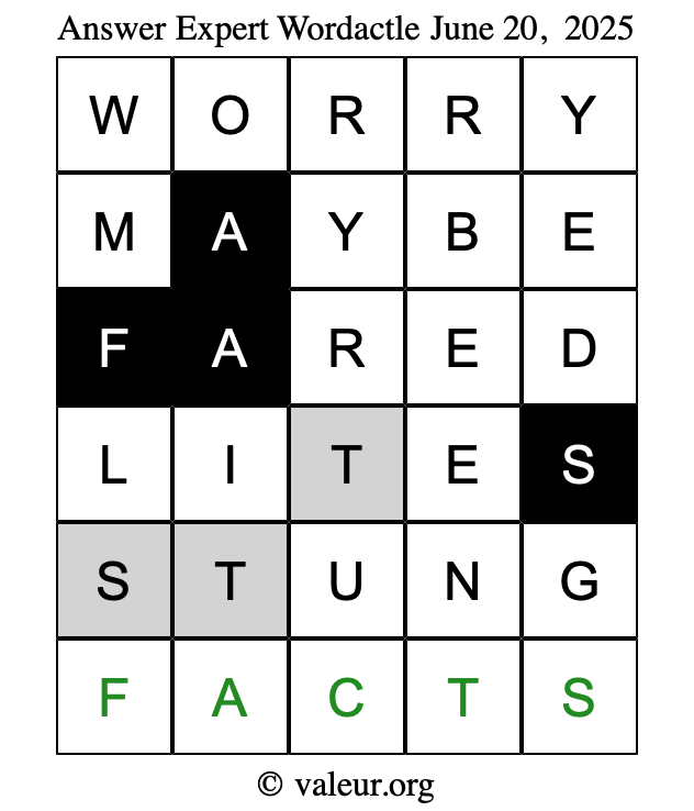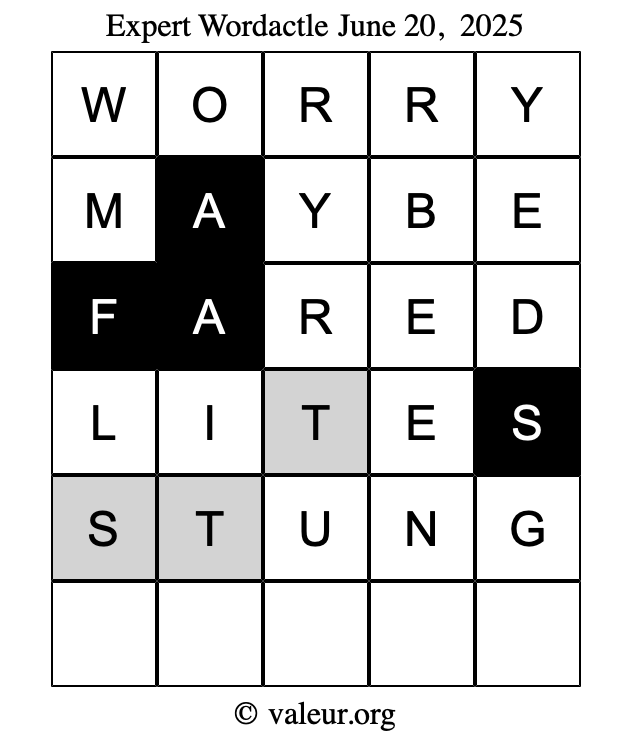 Here are the June 20, 2025 daily four Wordactle puzzles. You are welcome to print a copy of the puzzles and solve them by hand. For your convenience, we have also included the solutions further down the page so you can check your work.