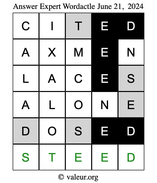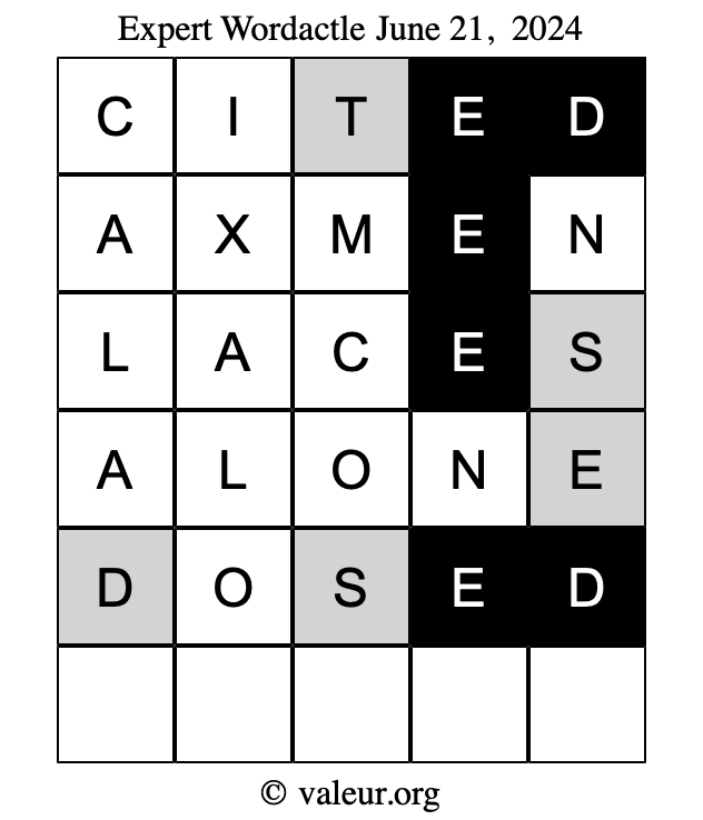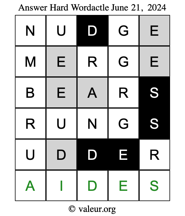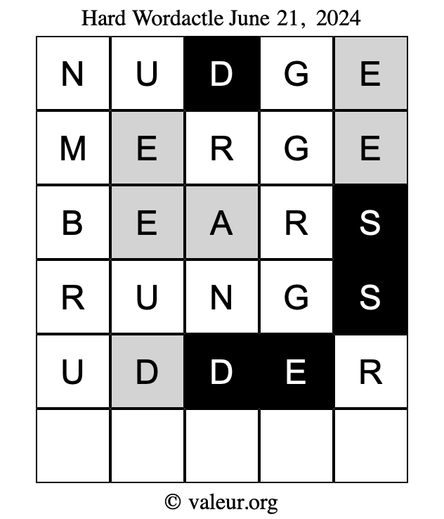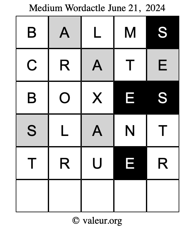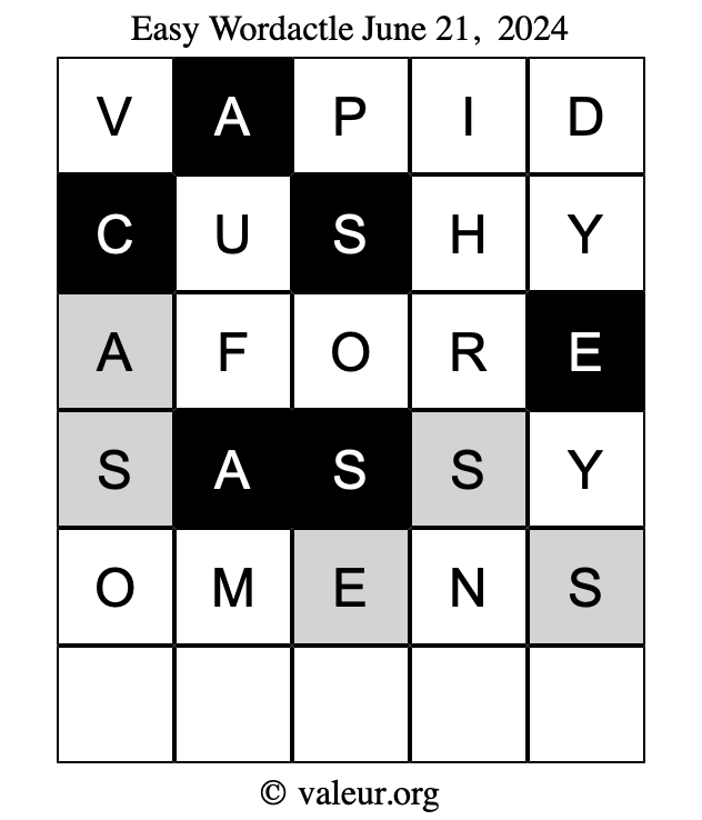 Here are the June 21, 2024 daily four Wordactle puzzles. You are welcome to print a copy of the puzzles and solve them by hand. For your convenience, we have also included the solutions further down the page so you can check your work.