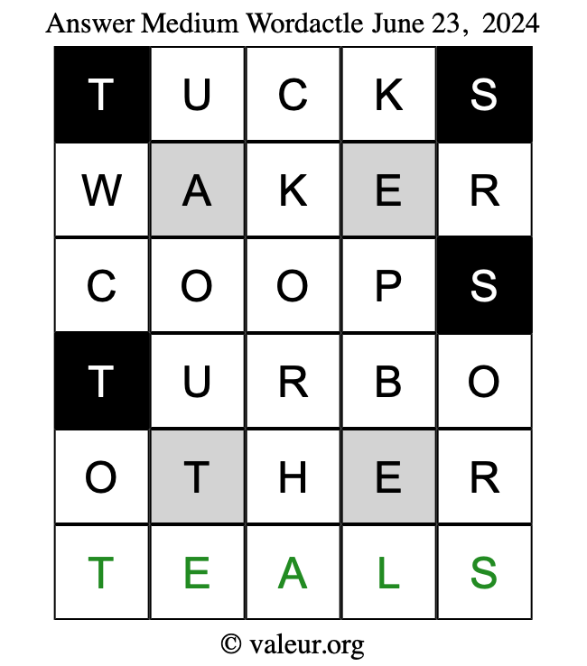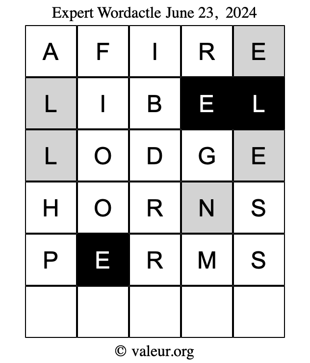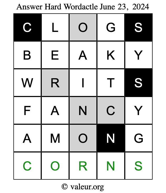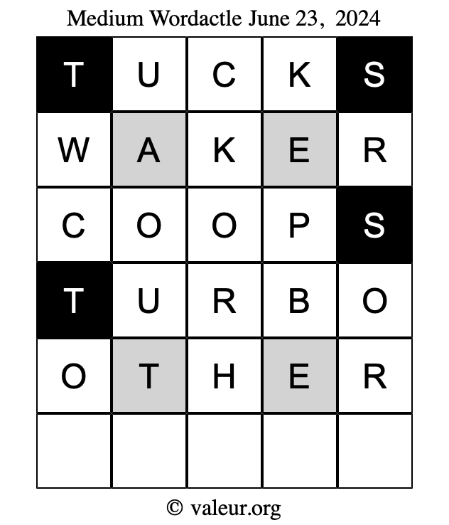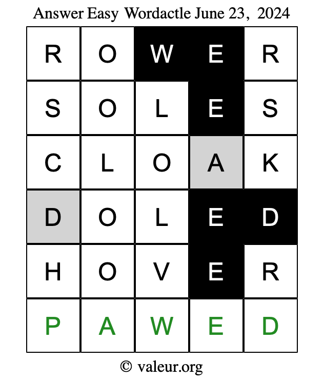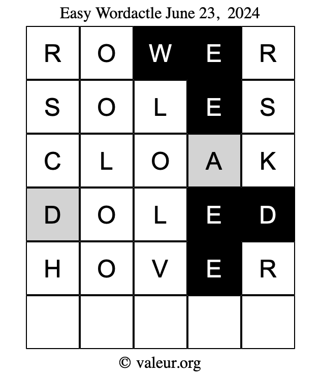 Here are the June 23, 2024 daily four Wordactle puzzles. You are welcome to print a copy of the puzzles and solve them by hand. For your convenience, we have also included the solutions further down the page so you can check your work.