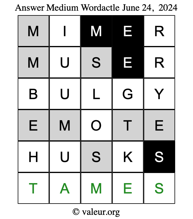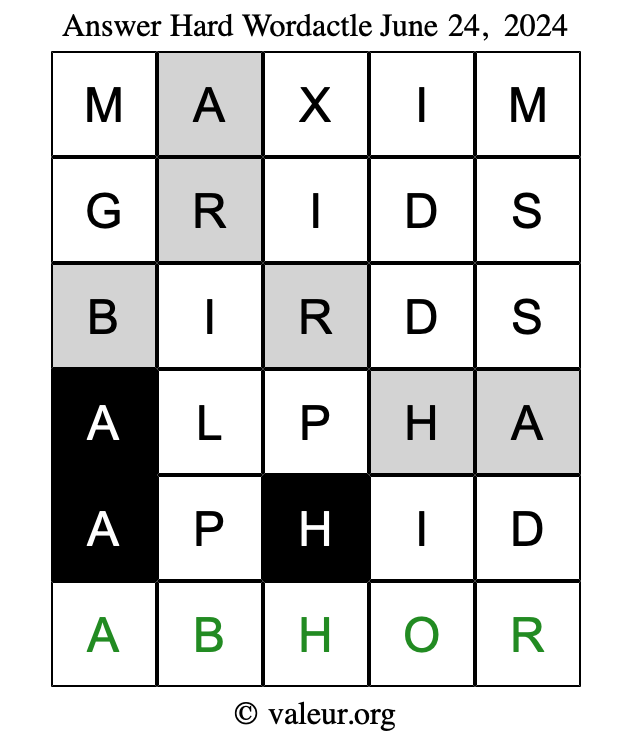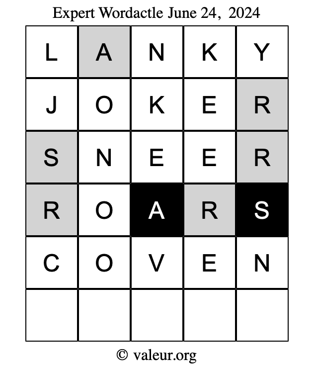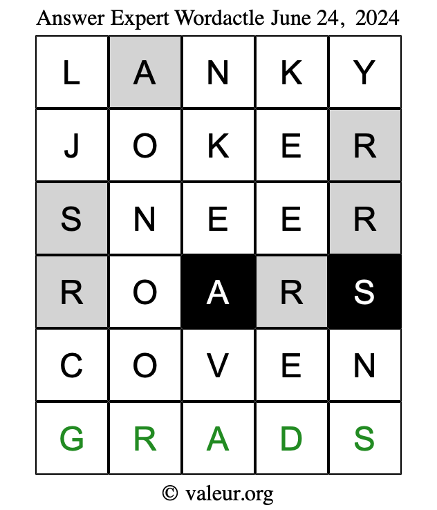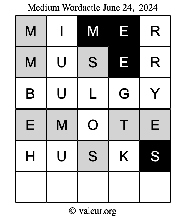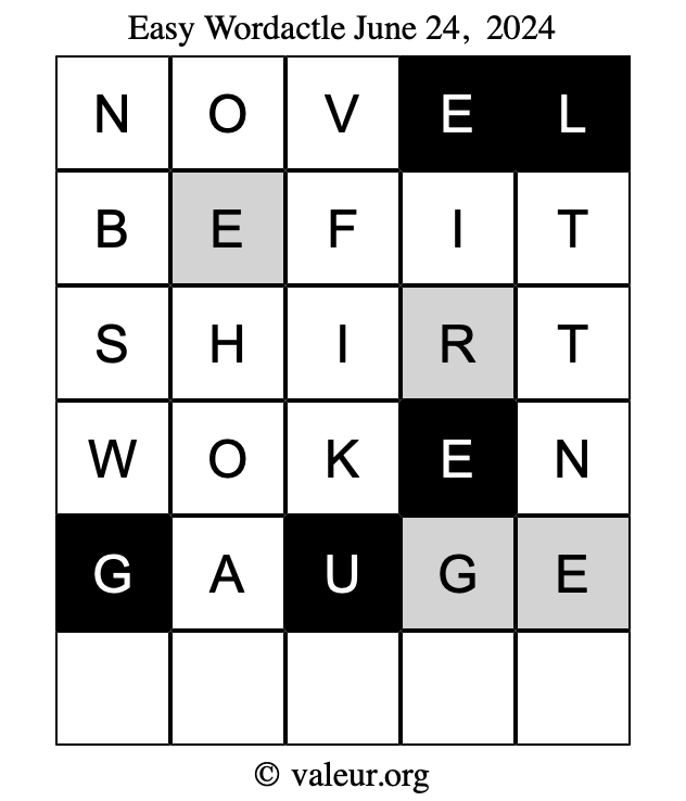 Here are the June 24, 2024 daily four Wordactle puzzles. You are welcome to print a copy of the puzzles and solve them by hand. For your convenience, we have also included the solutions further down the page so you can check your work.