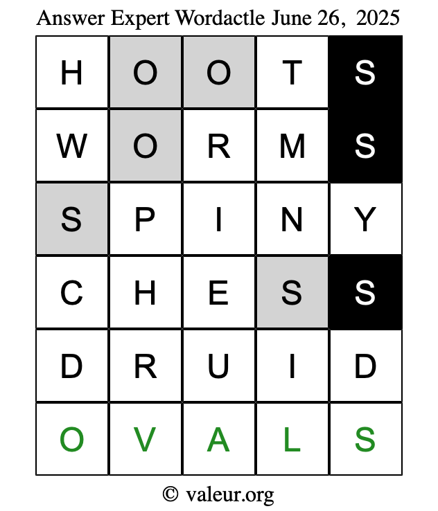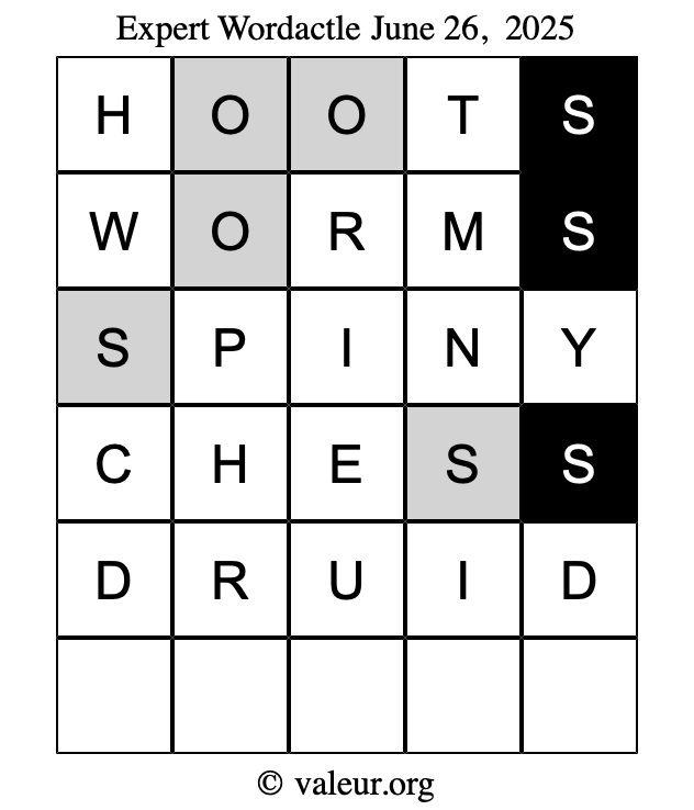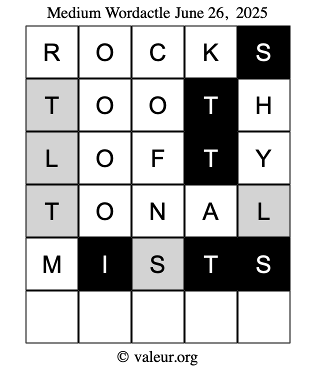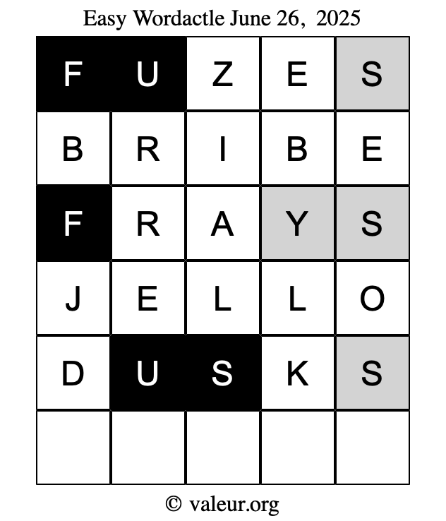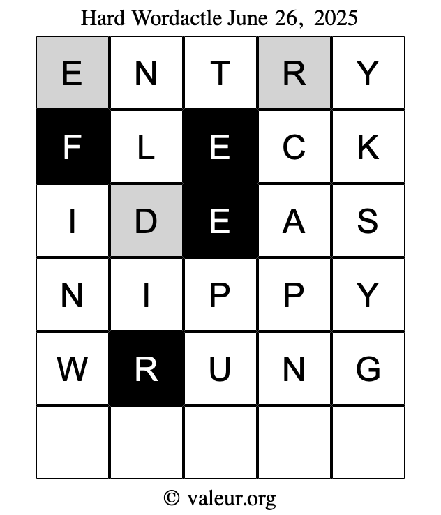 Here are the June 26, 2025 daily four Wordactle puzzles. You are welcome to print a copy of the puzzles and solve them by hand. For your convenience, we have also included the solutions further down the page so you can check your work.