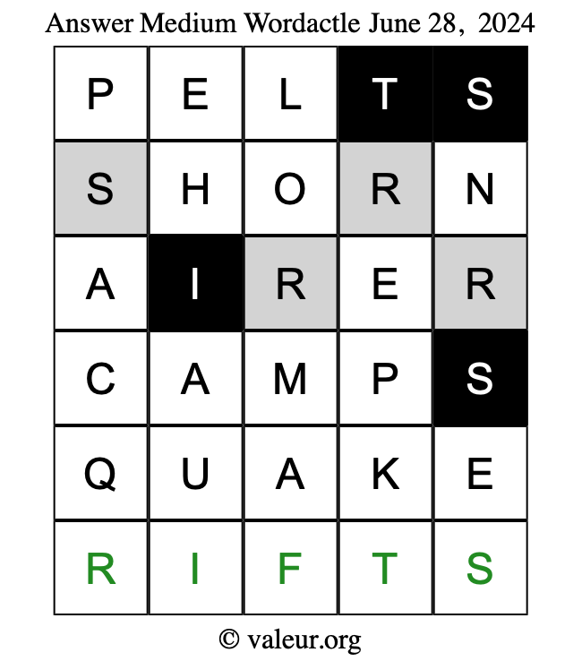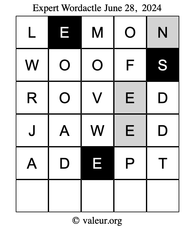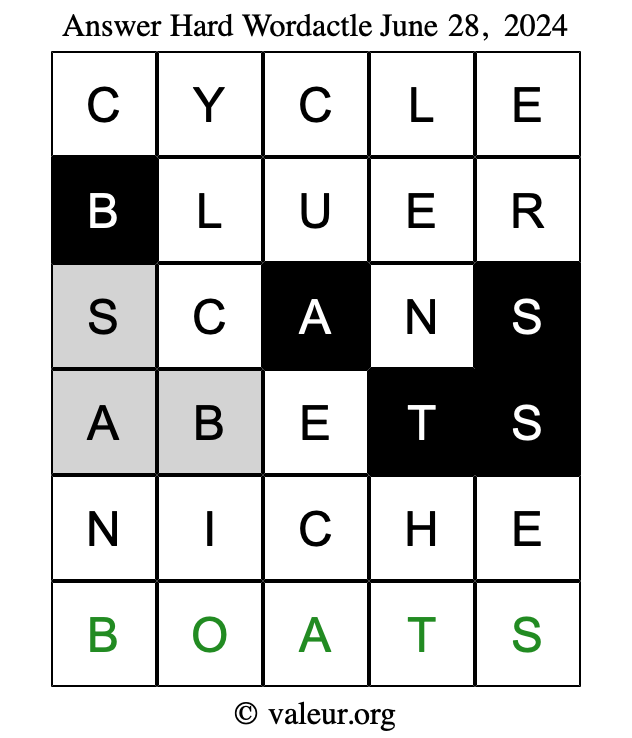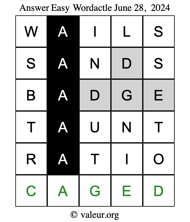 Here are the June 28, 2024 daily four Wordactle puzzles. You are welcome to print a copy of the puzzles and solve them by hand. For your convenience, we have also included the solutions further down the page so you can check your work.