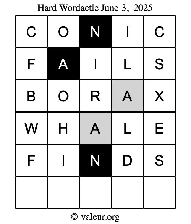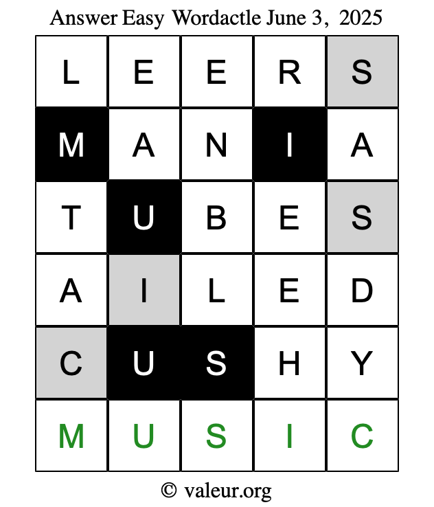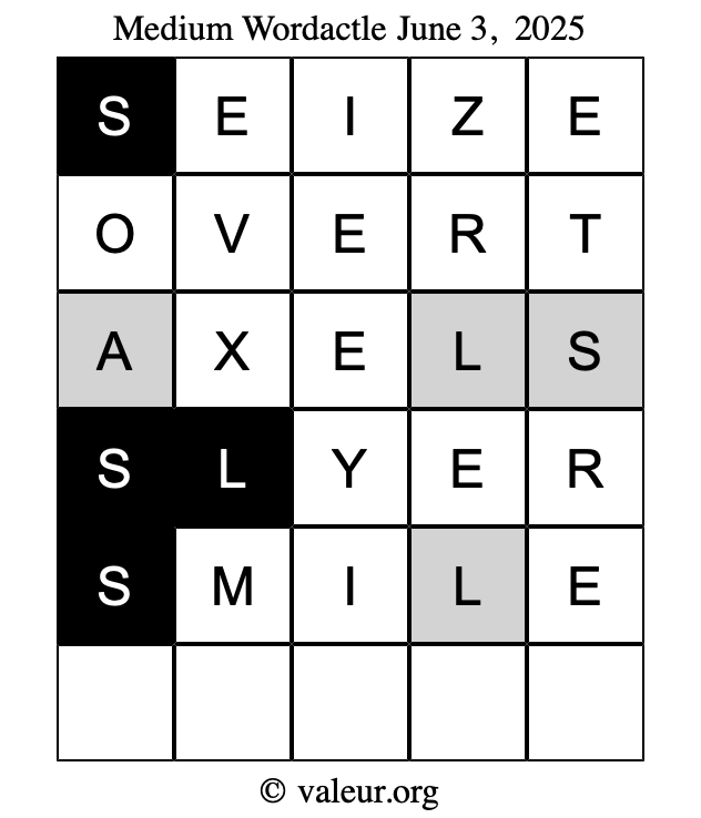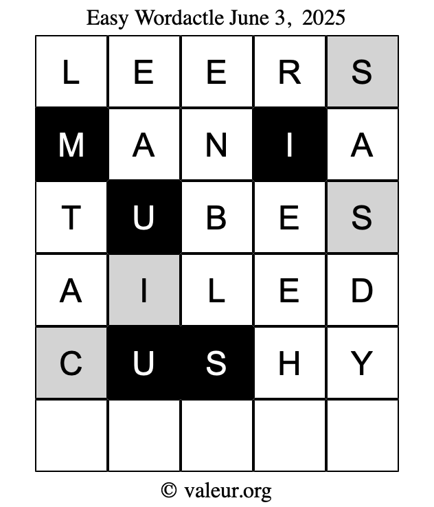 Here are the June 3, 2025 daily four Wordactle puzzles. You are welcome to print a copy of the puzzles and solve them by hand. For your convenience, we have also included the solutions further down the page so you can check your work.