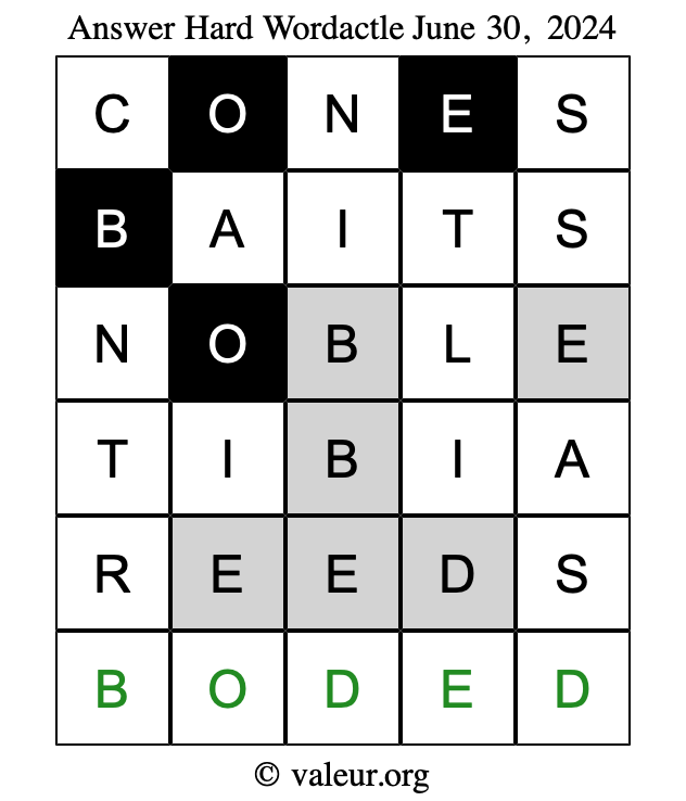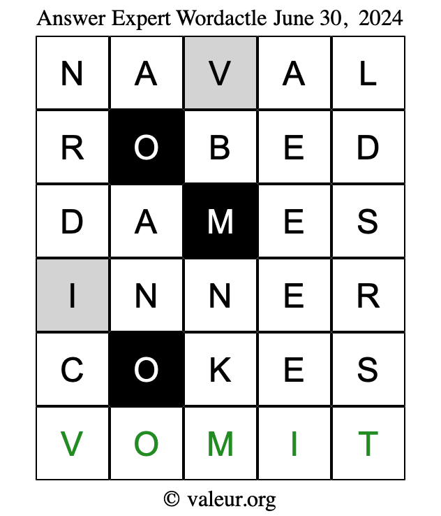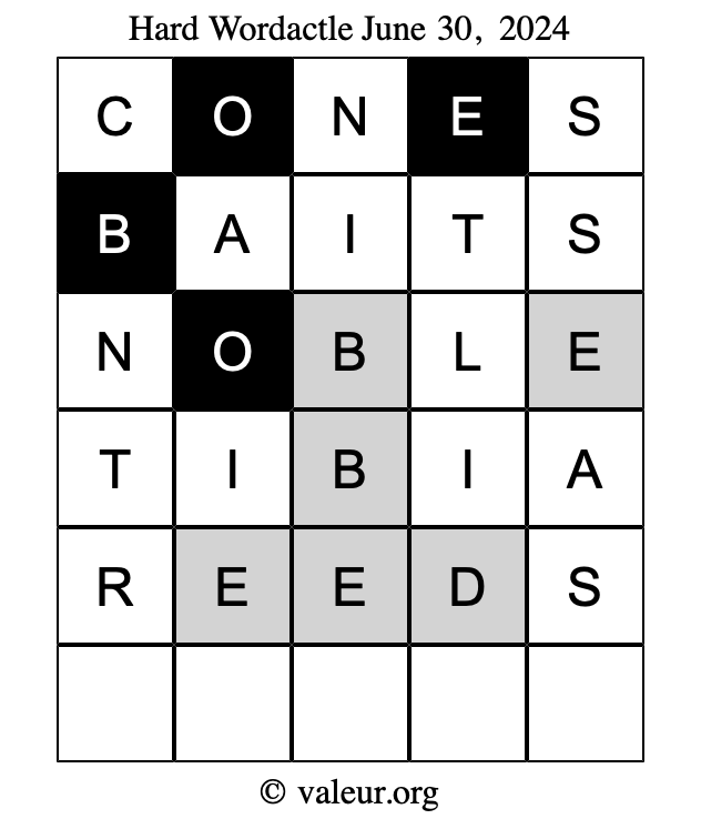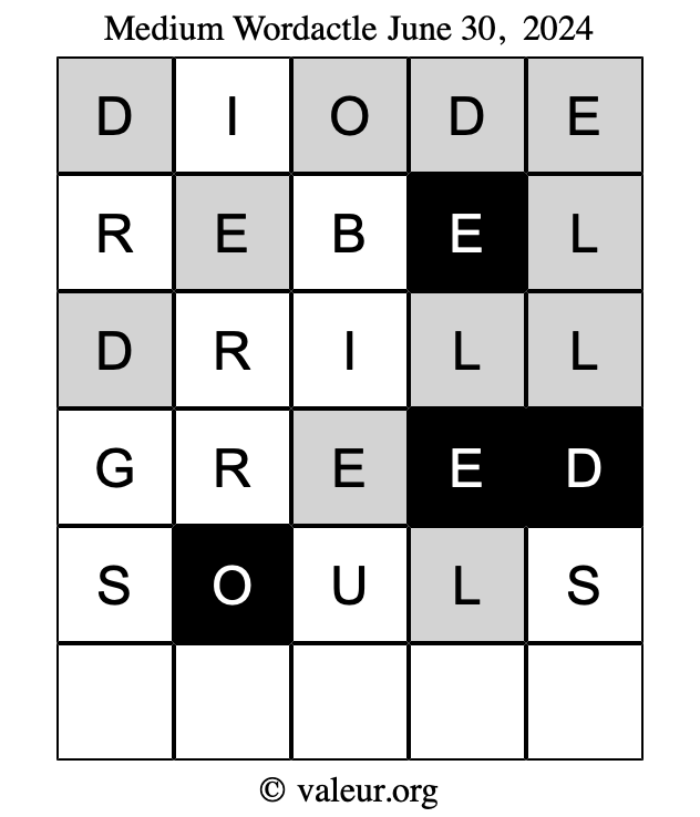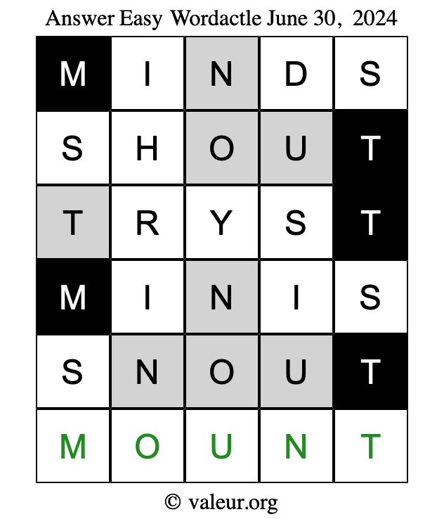 Here are the June 30, 2024 daily four Wordactle puzzles. You are welcome to print a copy of the puzzles and solve them by hand. For your convenience, we have also included the solutions further down the page so you can check your work.