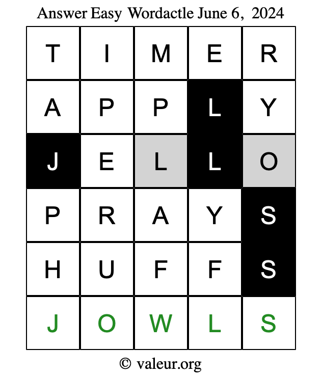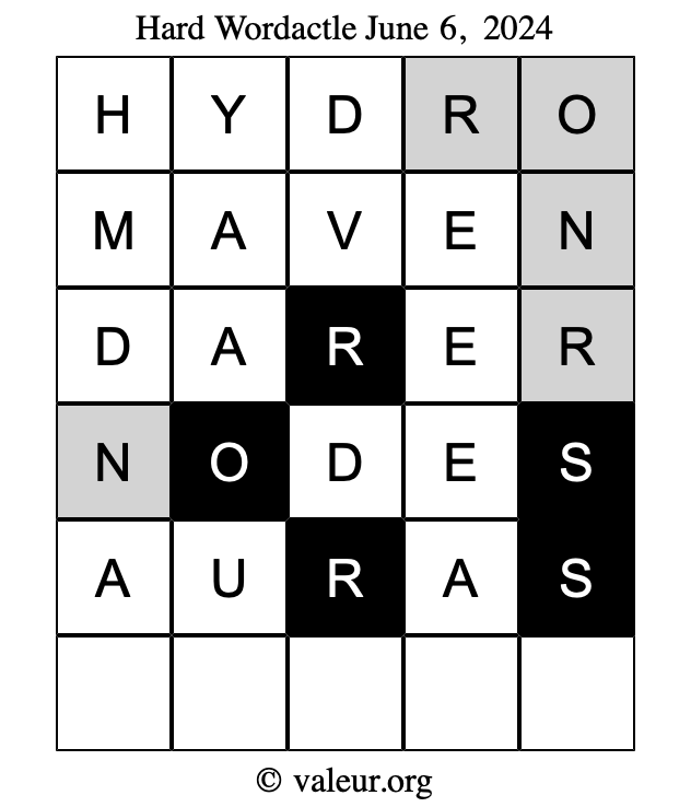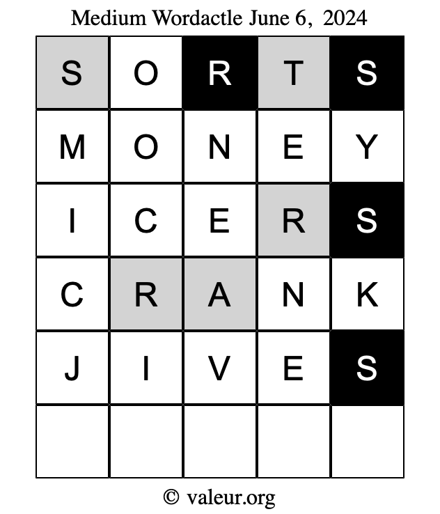 Here are the June 6, 2024 daily four Wordactle puzzles. You are welcome to print a copy of the puzzles and solve them by hand. For your convenience, we have also included the solutions further down the page so you can check your work.