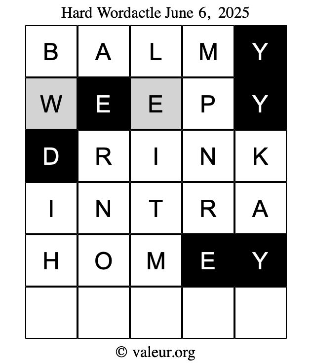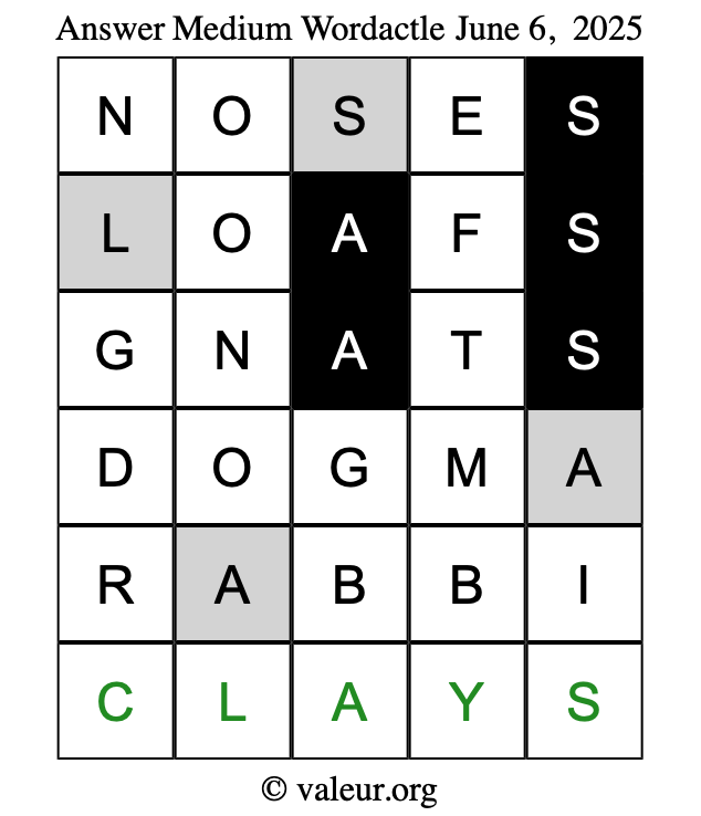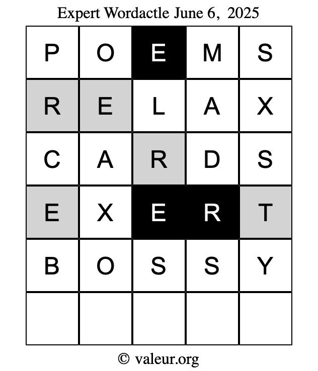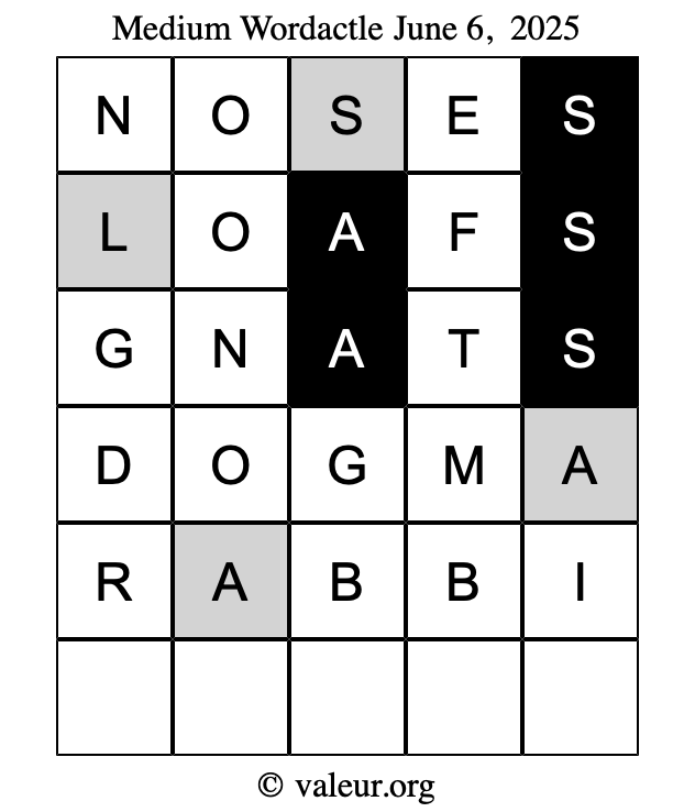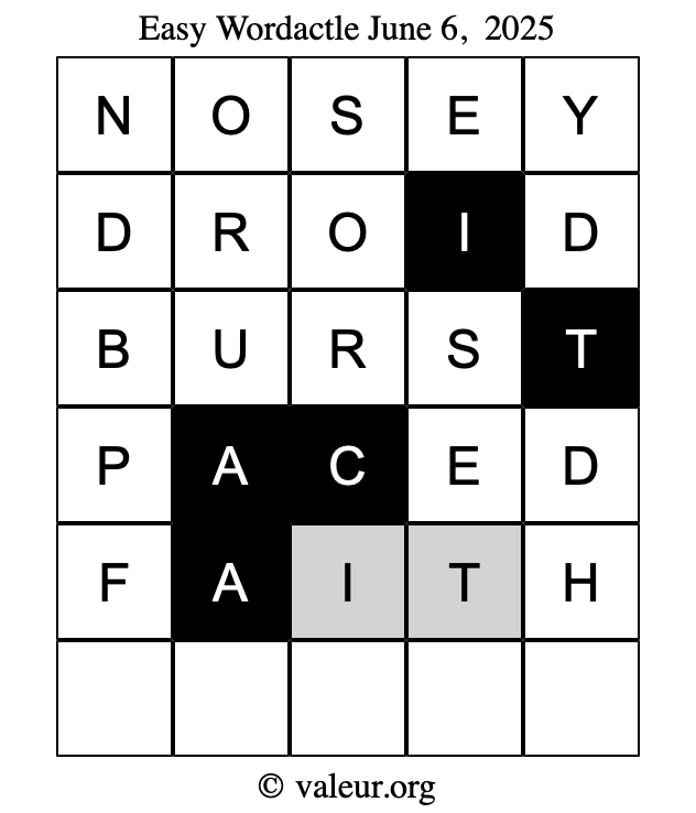Here are the June 6, 2025 daily four Wordactle puzzles. You are welcome to print a copy of the puzzles and solve them by hand. For your convenience, we have also included the solutions further down the page so you can check your work.