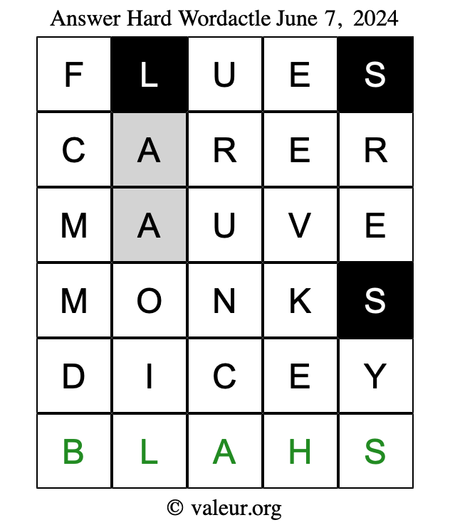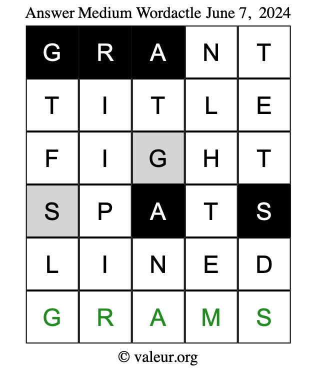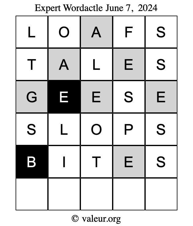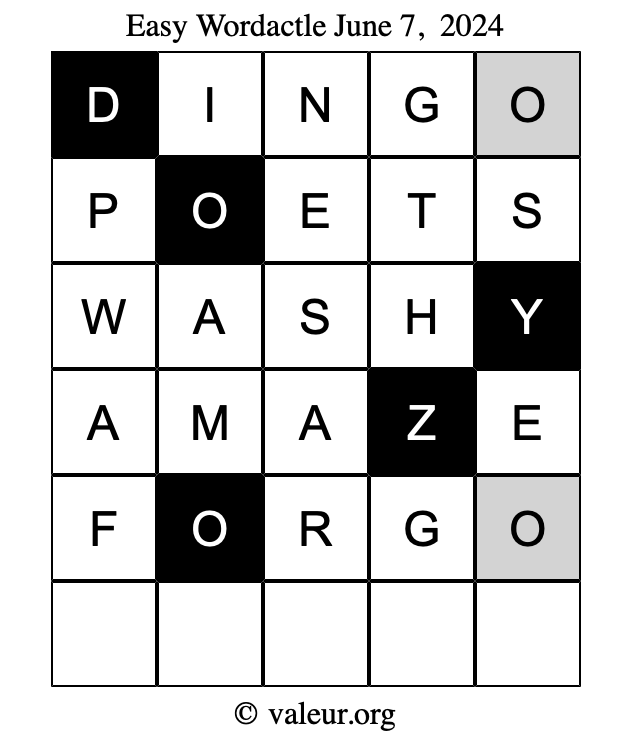 Here are the June 7, 2024 daily four Wordactle puzzles. You are welcome to print a copy of the puzzles and solve them by hand. For your convenience, we have also included the solutions further down the page so you can check your work.