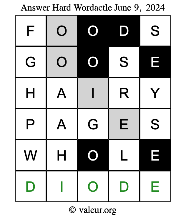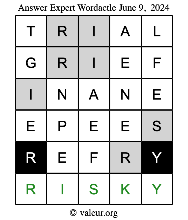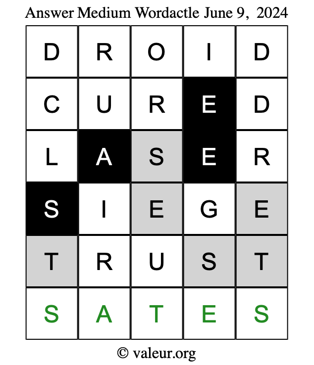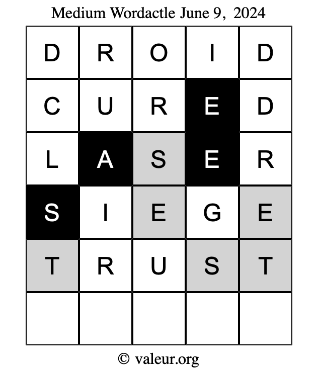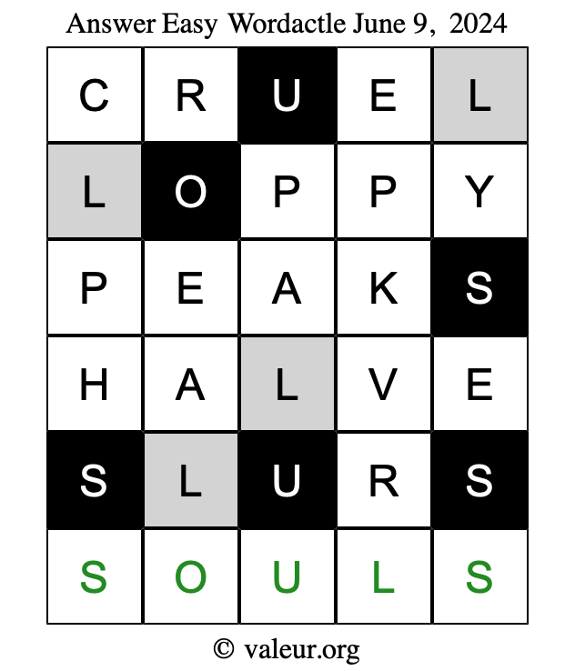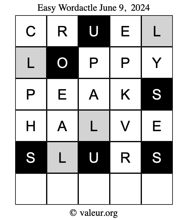 Here are the June 9, 2024 daily four Wordactle puzzles. You are welcome to print a copy of the puzzles and solve them by hand. For your convenience, we have also included the solutions further down the page so you can check your work.