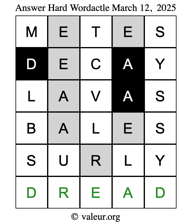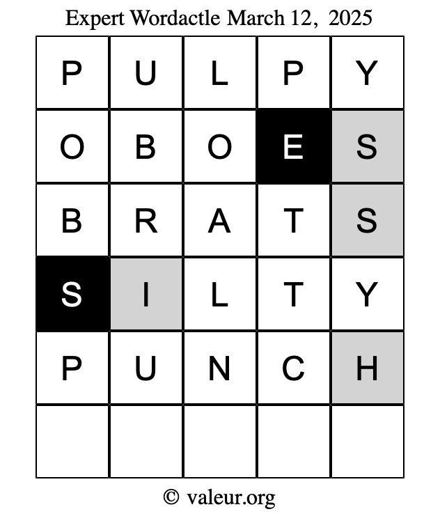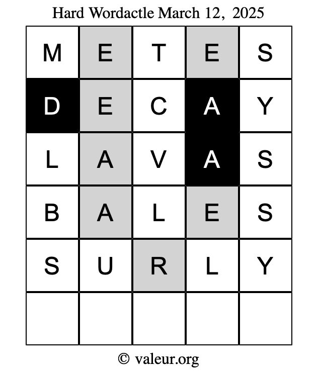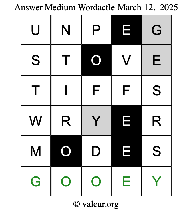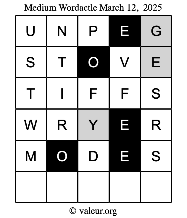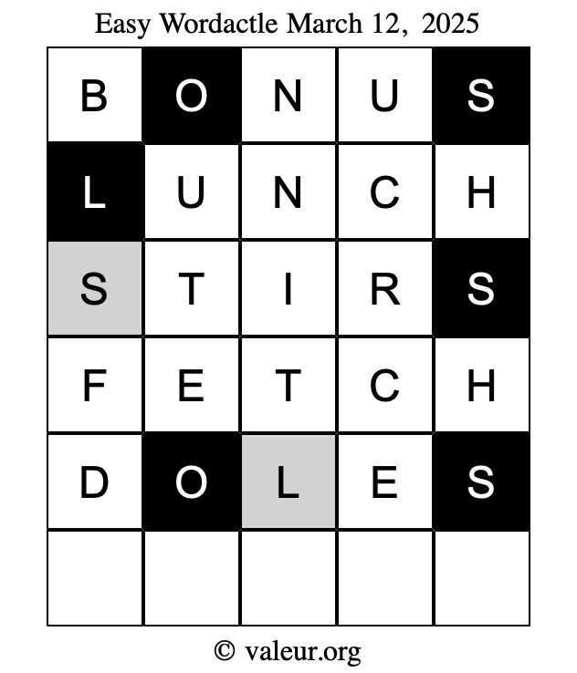 Here are the March 12, 2025 daily four Wordactle puzzles. You are welcome to print a copy of the puzzles and solve them by hand. For your convenience, we have also included the solutions further down the page so you can check your work.