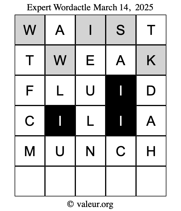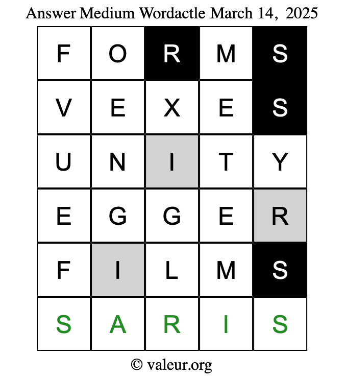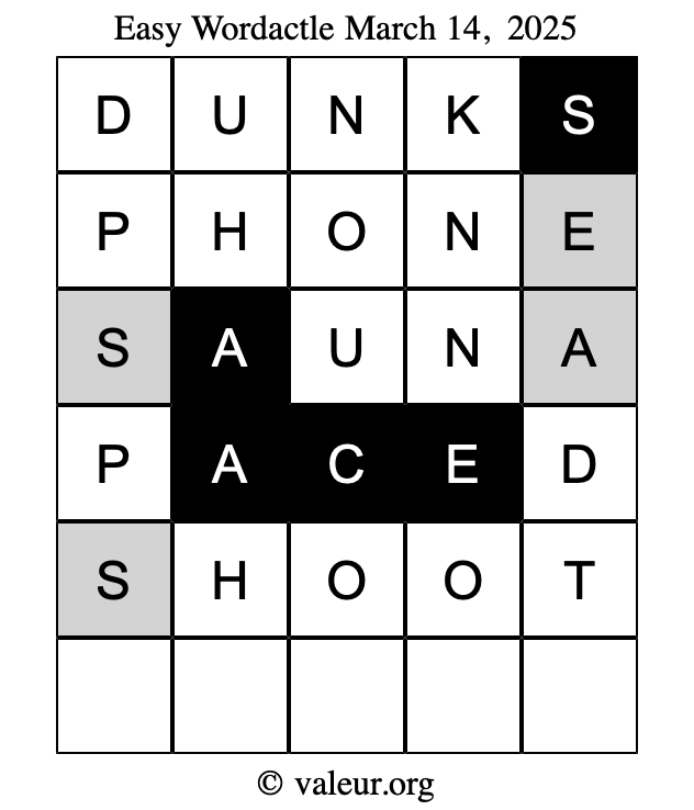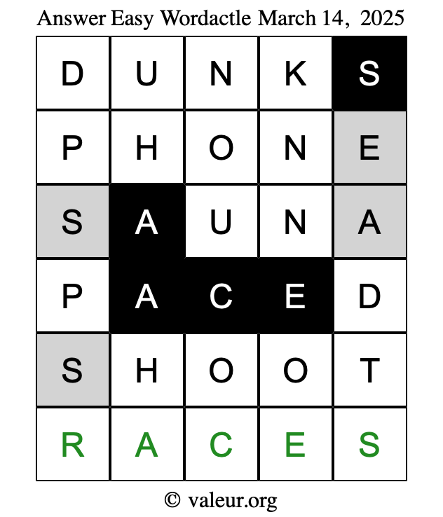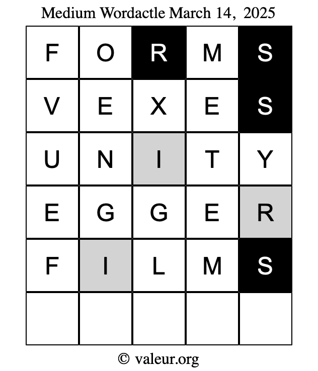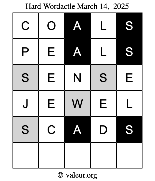 Here are the March 14, 2025 daily four Wordactle puzzles. You are welcome to print a copy of the puzzles and solve them by hand. For your convenience, we have also included the solutions further down the page so you can check your work.