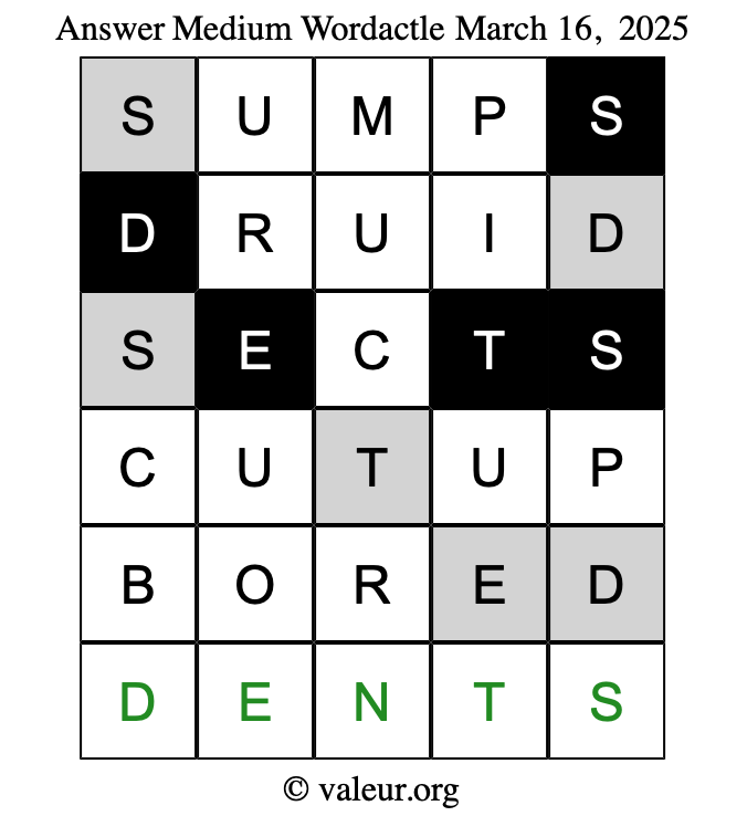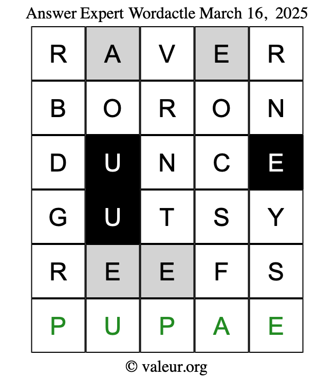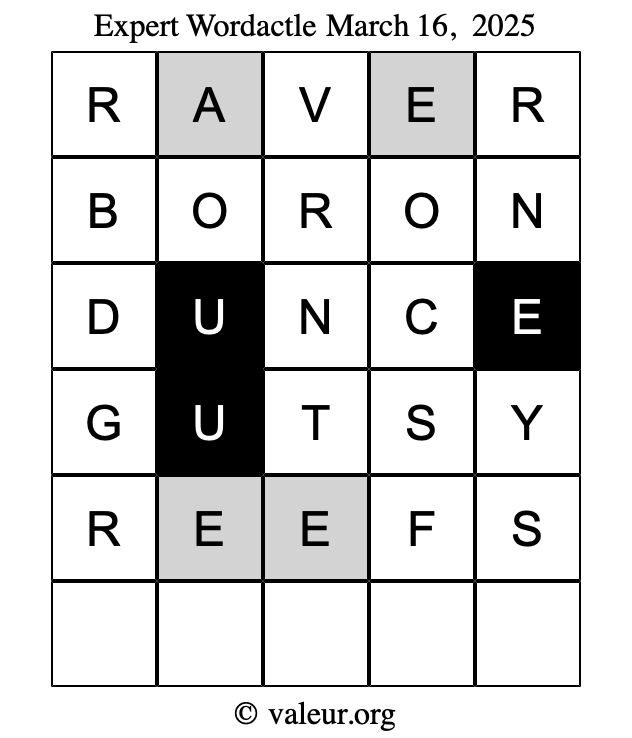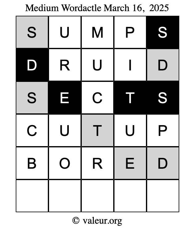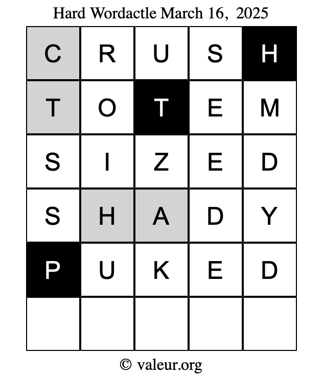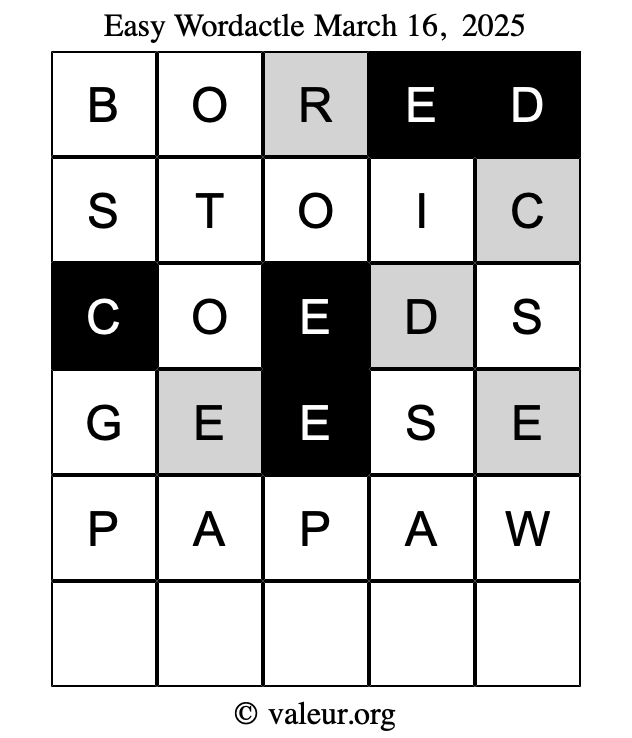 Here are the March 16, 2025 daily four Wordactle puzzles. You are welcome to print a copy of the puzzles and solve them by hand. For your convenience, we have also included the solutions further down the page so you can check your work.