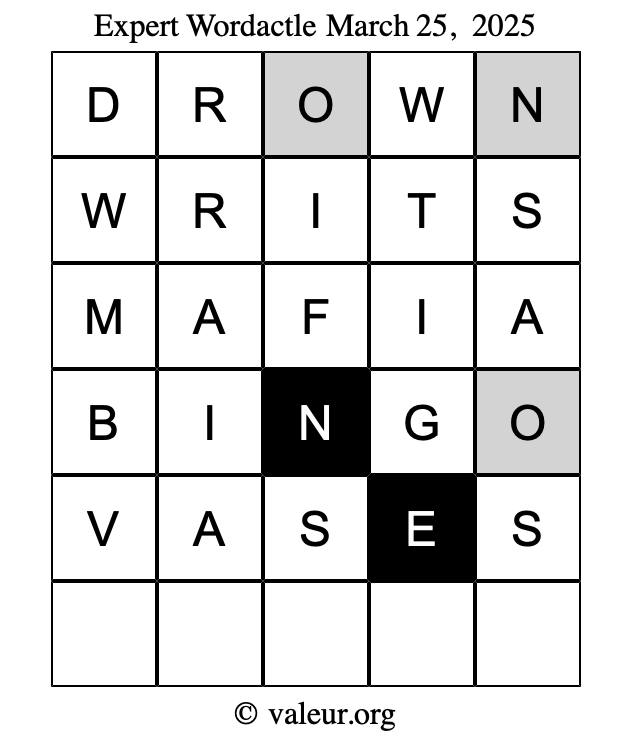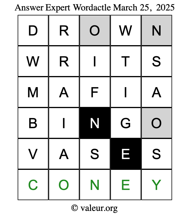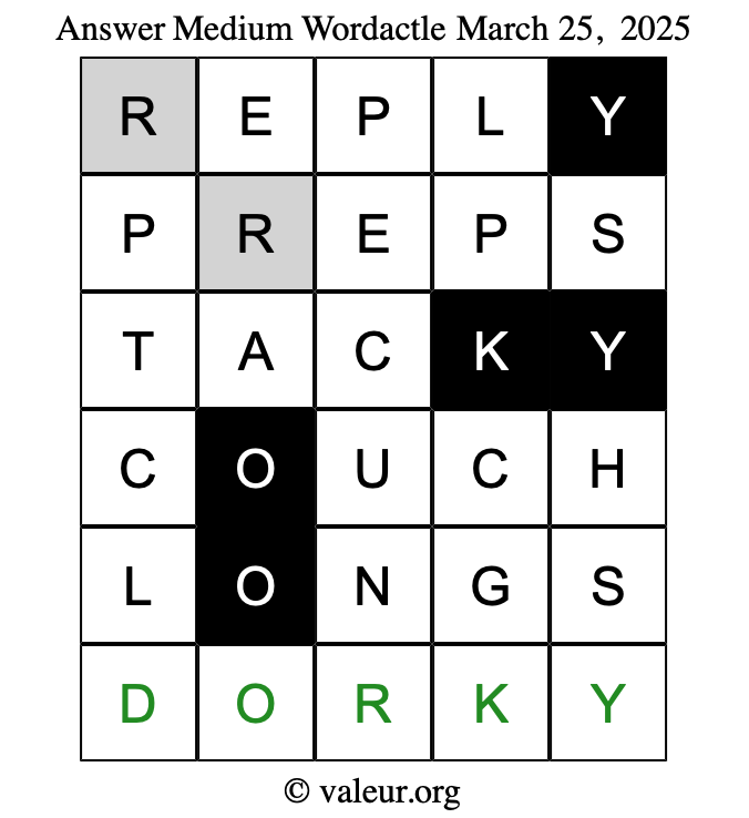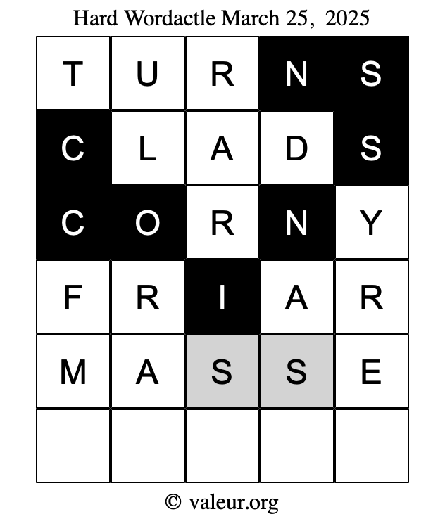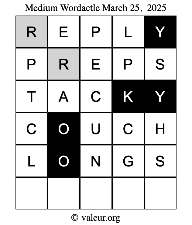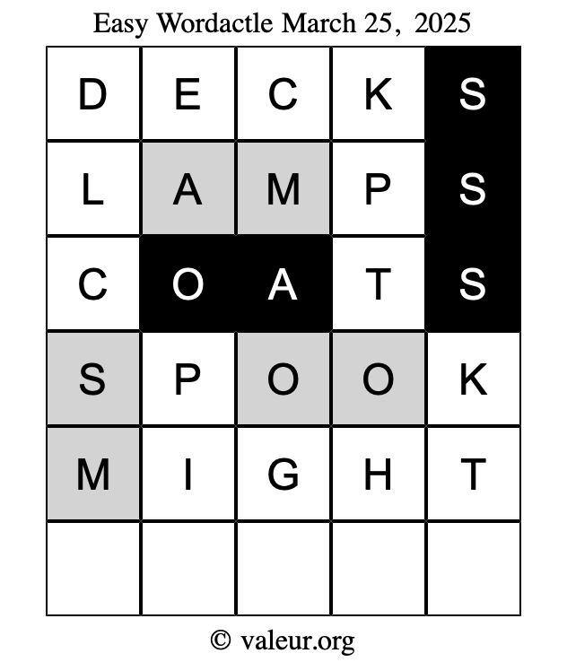 Here are the March 25, 2025 daily four Wordactle puzzles. You are welcome to print a copy of the puzzles and solve them by hand. For your convenience, we have also included the solutions further down the page so you can check your work.