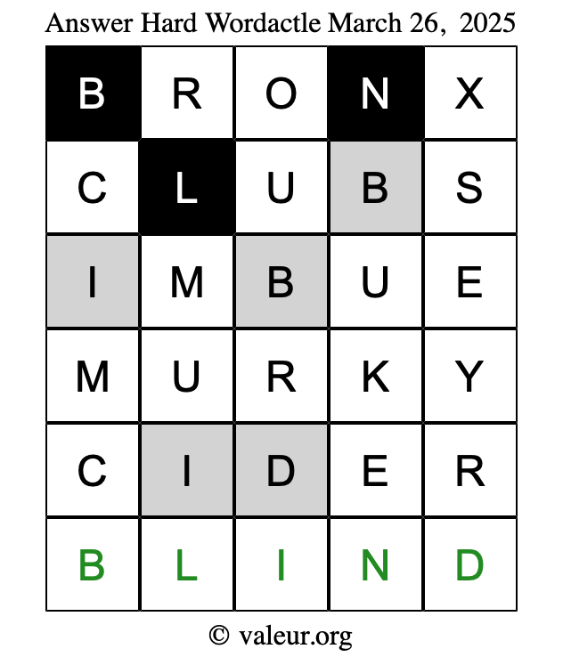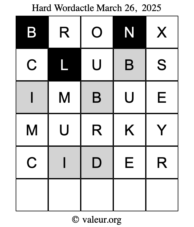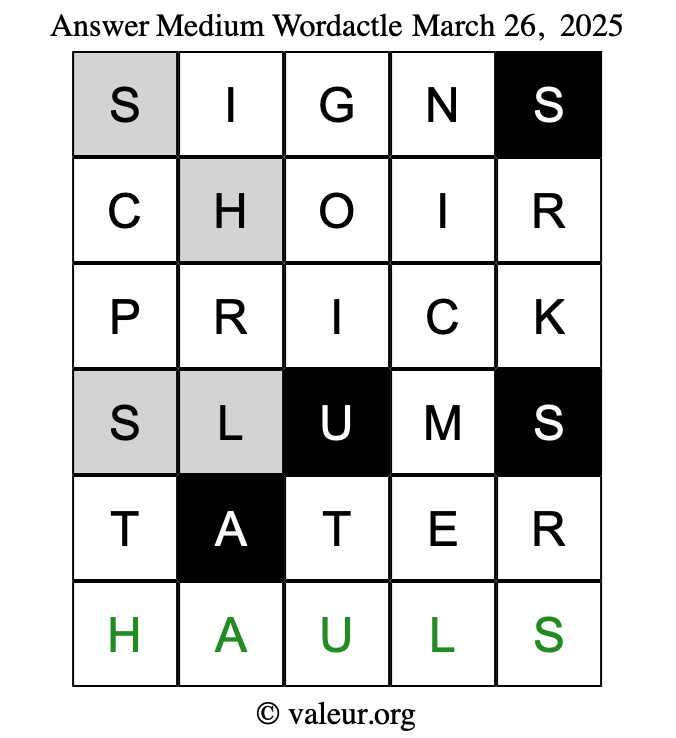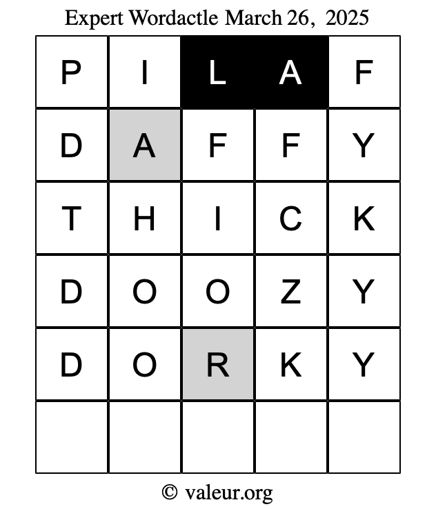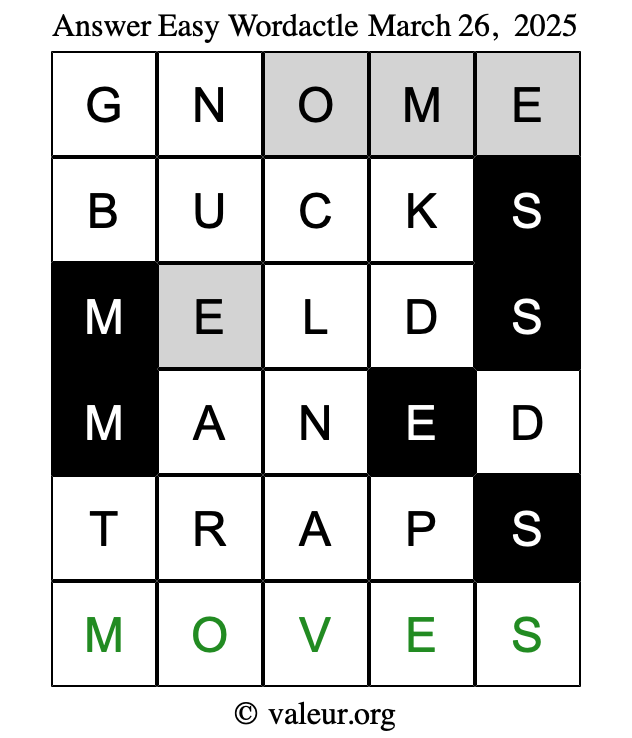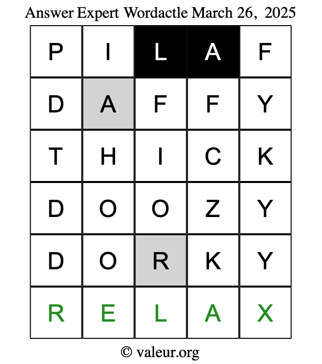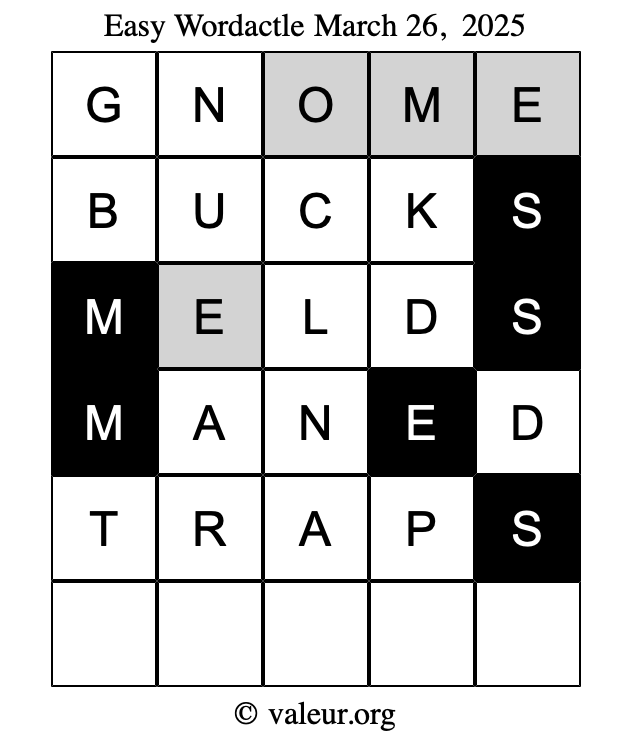 Here are the March 26, 2025 daily four Wordactle puzzles. You are welcome to print a copy of the puzzles and solve them by hand. For your convenience, we have also included the solutions further down the page so you can check your work.